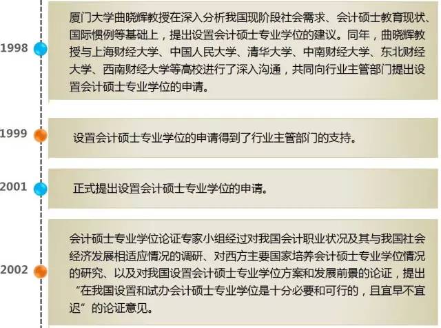 2004年3月1日,會計碩士專業學位正式設立。國務院學位委員會、教育部下發學位[2004]3號文件,正式宣布成立全國會計碩士(MPAcc)專業學位教育指導委員會,負責會計碩士專業學位教育指導、監督、研究、咨詢等工作。