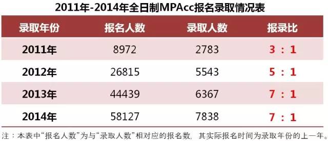除培養單位數量迅速增加之外,MPAcc在招生方面的影響力也越來越大。自2012年起,MPAcc已成為報考人數僅次于工商管理碩士的專業學位類別,2013、2014年報錄比更是達到了7:1: