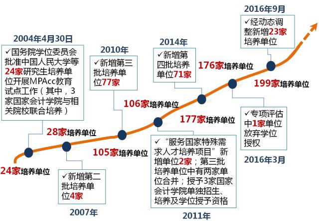 2004年3月18日,全國會計碩士(MPAcc)專業學位教育指導委員會(以下簡稱“會計教指委”)成立大會暨第一次會議在北京召開。4月30日,國務院學位委員會印發學位辦[2004]28號文件,批準開展會計碩士專業學位教育試點工作: