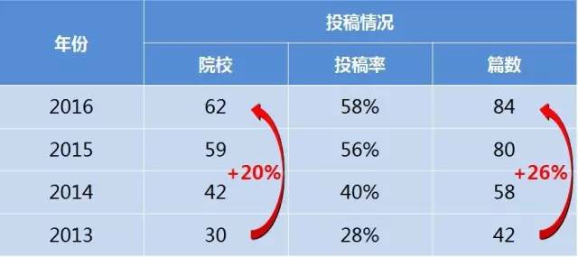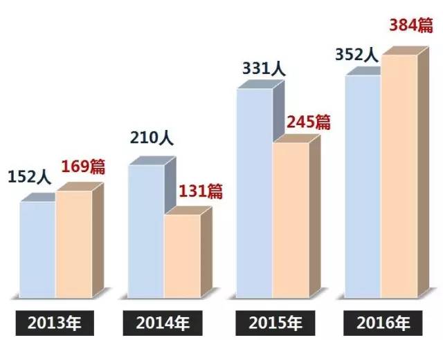 (注:紅色數字為2013-2016年平均年增長率。2013年《全國會計碩士專業學位優秀學位論文評選辦法(試行)》公布實施,明確規定每單位限投1篇參選論文,培養規模超過百人或上一年度獲得優秀論文獎的單位可投2篇。)