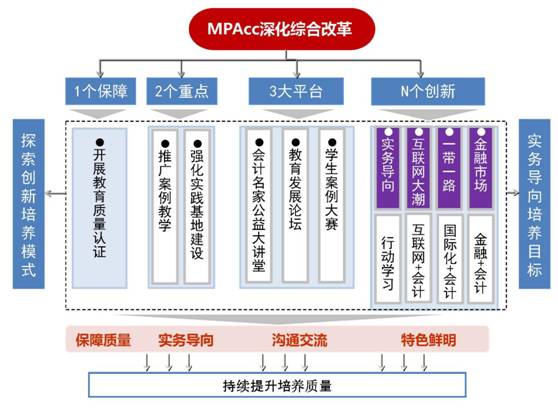 根據《教育部關于做好深化專業學位研究生教育綜合改革試點工作的通知》(教研函[2015]2號文件),在未來,會計教指委將繼續推進“123+N”的深化綜合改革,即:建立一個保障體系:MPAcc教育質量認證;開展兩項重點工作:推廣案例教學與強化實踐基地建設;搭建三大交流平臺:MPAcc會計名家公益大講堂、MPAcc教育發展論壇、MPAcc學生案例大賽,以及開展N個改革創新試點,如:“行動學習法”、“互聯網+會計”、“國際化+會計”、“整合性學習”、“翻轉課堂”、“校企合作”、“國際化工程”、“資本市場”“創業企業”、“職業生涯規劃”等MPAcc培養模式改革: