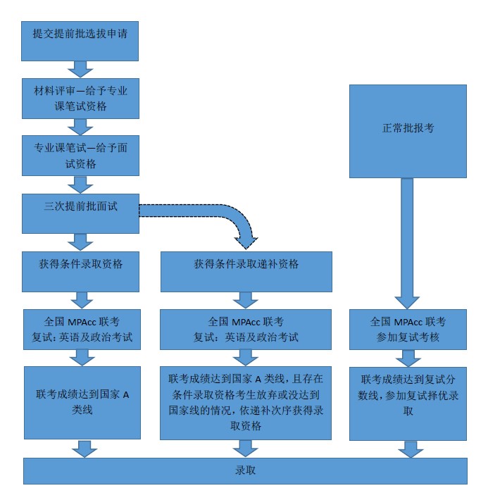 2020年中國人民大學商學院MPAcc非全日制提前批選拔將分為三個批次進行,每位考生只能申請一次提前批選拔,提前批選拔要求如下: