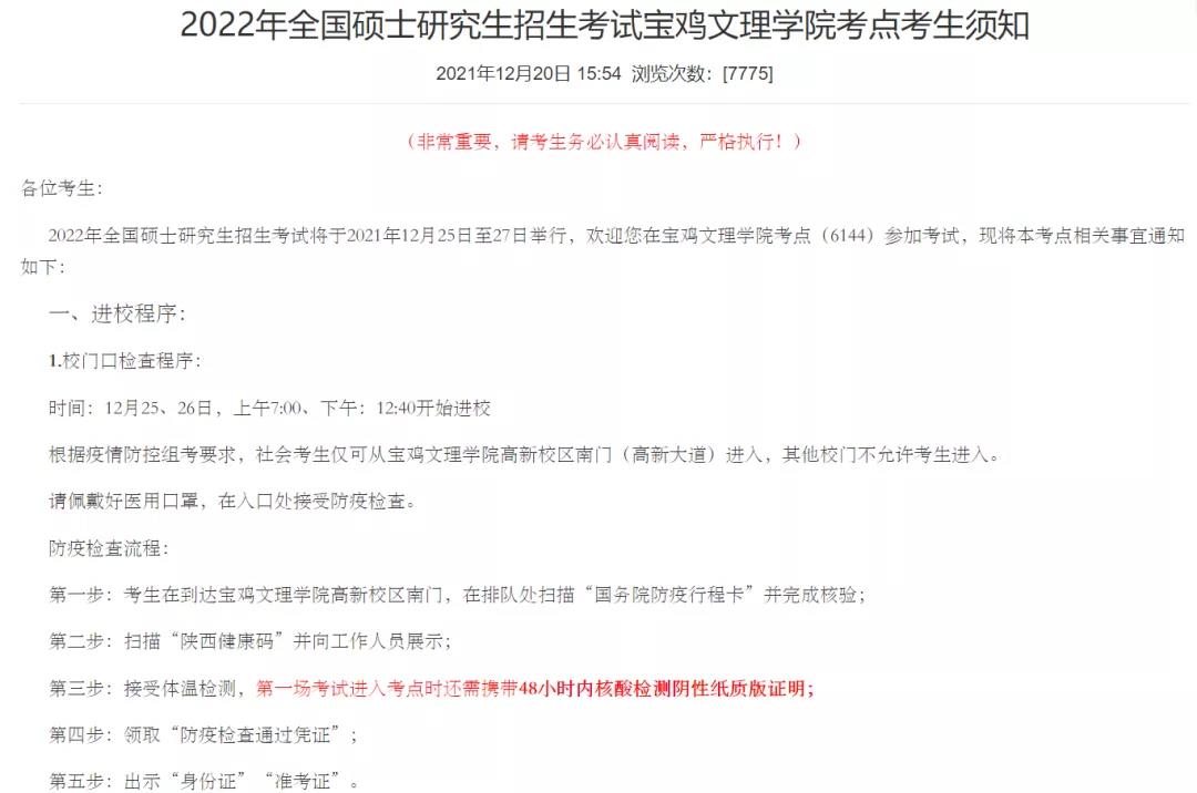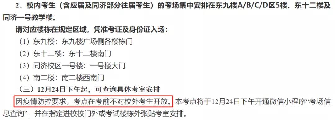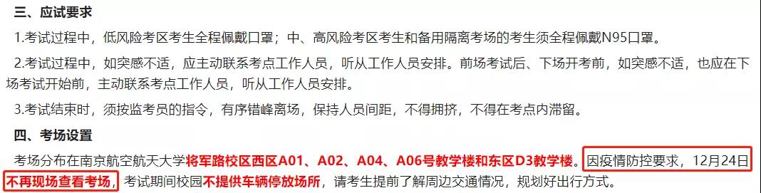 因疫情防控要求,12月24日不再現場查看考場,考試期間校園不提供車輛停放場所,請考生提前了解周邊交通情況,規劃好出行方式。