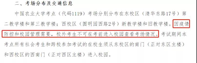 中國農業大學考點(代碼1119)考場分別分布在東校區(清華東路17號)第二教學樓和第三教學樓;西校區(圓明園西路2號)新教學樓和舊教學樓。因疫情防控和校園管理需要,校外考生不可在考前進入校園查看考場情況。
