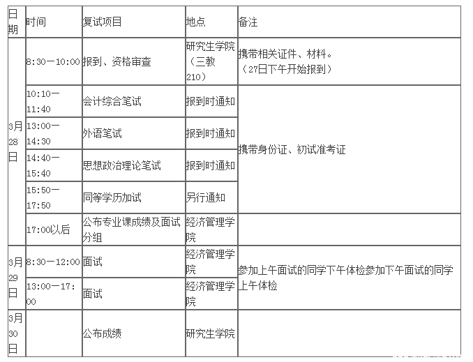 復試內容包括資格審查、體檢、會計綜合筆試(內容涵蓋: 財務會計;管理會計;財務管理;成本會計,其中財務會計是指初級和中級部分,占比50%以上)、英語筆試(含聽力)、思想政治理論筆試(開卷)、綜合面試(含英語口語測試)。同等學力考生須加試基礎會計和管理學。