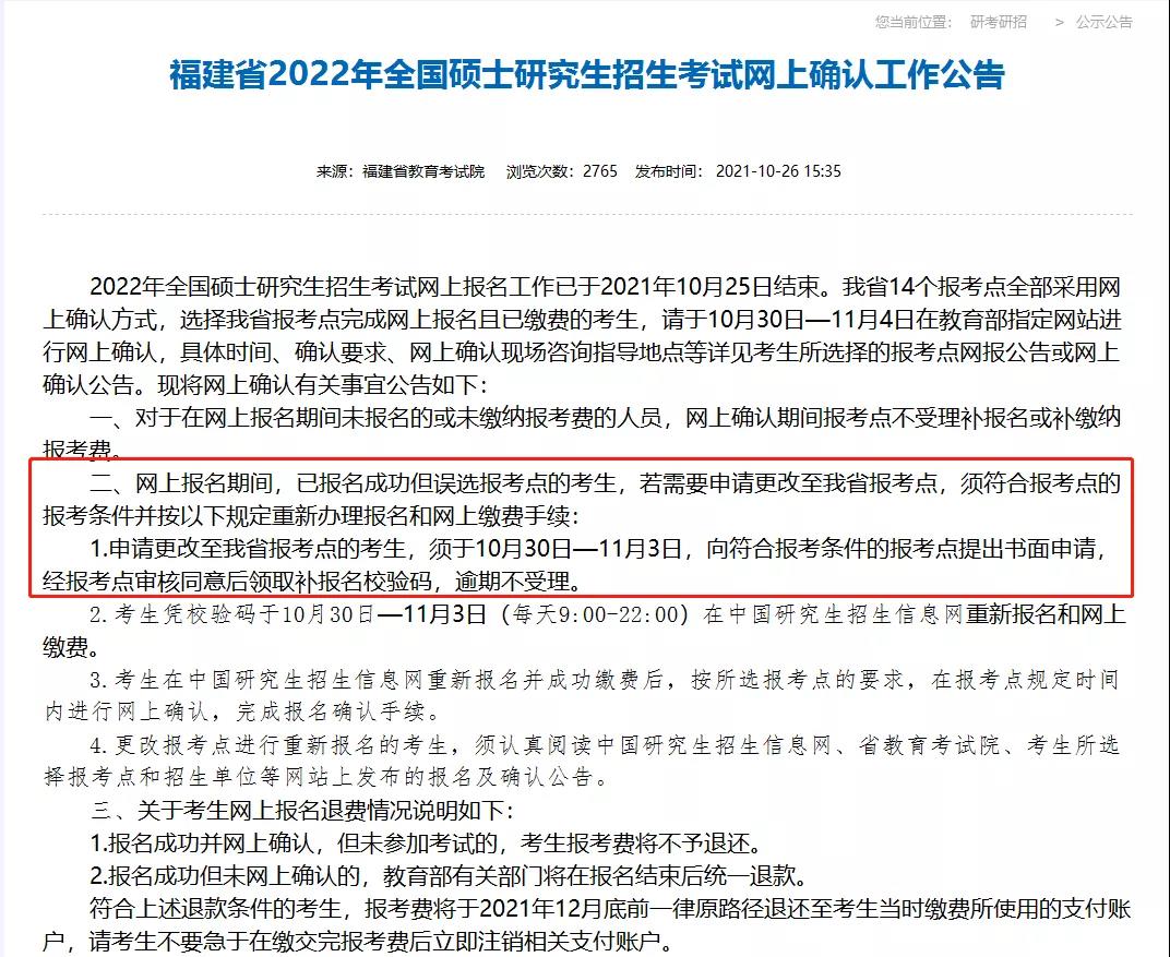 申請(qǐng)更改至福建報(bào)考點(diǎn)的考生,須于10月30日—11月3日,向符合報(bào)考條件的報(bào)考點(diǎn)提出書面申請(qǐng),經(jīng)報(bào)考點(diǎn)審核同意后領(lǐng)取補(bǔ)報(bào)名校驗(yàn)碼,逾期不受理。