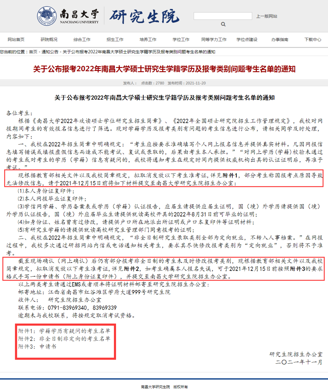 網(wǎng)上確認(rèn)早就已經(jīng)結(jié)束,部分高校還在陸續(xù)公布資格審查不符的考生名單,其中有些可能只需要修改信息,但不少考生直接被取消資格! 01 南昌大學(xué) 前幾天,南昌大學(xué)發(fā)布了兩則公告:《關(guān)于取消部分2022年報(bào)考南昌大學(xué)碩士研究生考生考試資格的通知》、《關(guān)于公布報(bào)考2022年南昌大學(xué)碩士研究生學(xué)籍學(xué)歷及報(bào)考類別問題考生名單的通知》。 02 有作弊違規(guī)記錄不能參加考研嗎? 根據(jù)教育部有關(guān)規(guī)定,在考研網(wǎng)報(bào)過程中,考生務(wù)必準(zhǔn)確填寫個(gè)人網(wǎng)上報(bào)名信息并提供真實(shí)材料。否則,因此造成不能考試、復(fù)試或錄取的,后果由考生本人承擔(dān)。 2022年招生簡章中也明確規(guī)定,“考生要準(zhǔn)確填寫本人所受獎(jiǎng)懲情況,特別是要如實(shí)填寫在參加普通和成人高等學(xué)校招生考試、全國碩士研究生招生考試、高等教育自學(xué)考試等國家教育考試過程中因違紀(jì)、作弊所受處罰情況。如未填寫,一經(jīng)查實(shí),將取消報(bào)考資格,對弄虛作假者,招生單位將按照《國家教育考試違規(guī)處理辦法》嚴(yán)肅處理。” 北京市 所有社會考生和跨校參加考試的在校生均須提供本人考前48小時(shí)內(nèi)(12月23日(含)以后)的核酸檢測陰性報(bào)告。 山東省 從發(fā)生本土疫情省份入魯返魯?shù)目忌毺峁﹩⒊糖?8小時(shí)內(nèi)核酸檢測陰性紙質(zhì)報(bào)告和抵達(dá)后考前48小時(shí)內(nèi)的核酸檢測陰性紙質(zhì)報(bào)告,并在隔離考場考試
