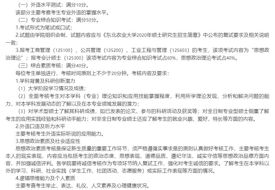 導讀:研究生復試是同學們通關考研的重要一環,想要在復試階段游刃有余,必須做好充分的準備。為了幫助2021MPA考生更好地著手準備復試,小編為大家整理了“2021MPA復試:東北農業大學MPA復試內容、復試要求、復試成績計算”,內容主要來自2020院校官網公布的復試信息,希望對大家有所幫助!