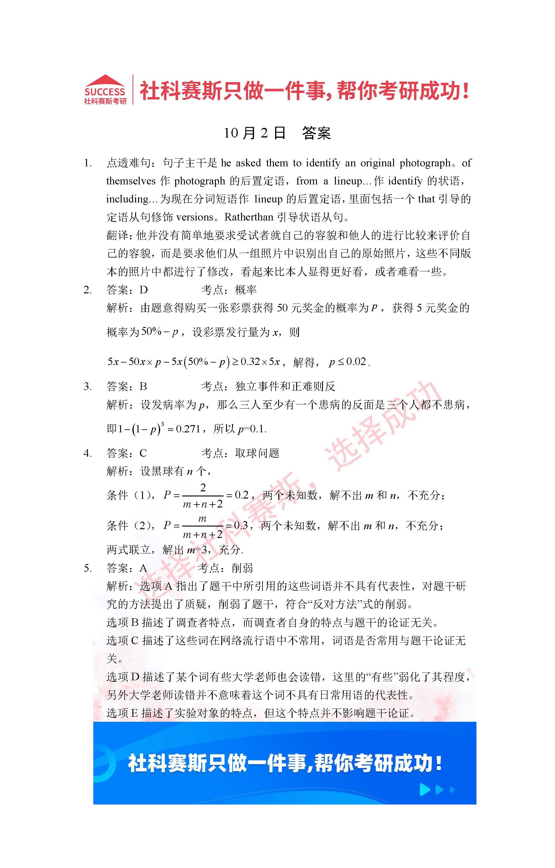 導讀:考研是一場持久戰,保持良好的學習習慣,是能確保復習高效的關鍵。今天社科賽斯MBA備考網小編整理了“2022管理類聯考10月2日每日一練及答案”的內容,希望能對廣大考生有所幫助。