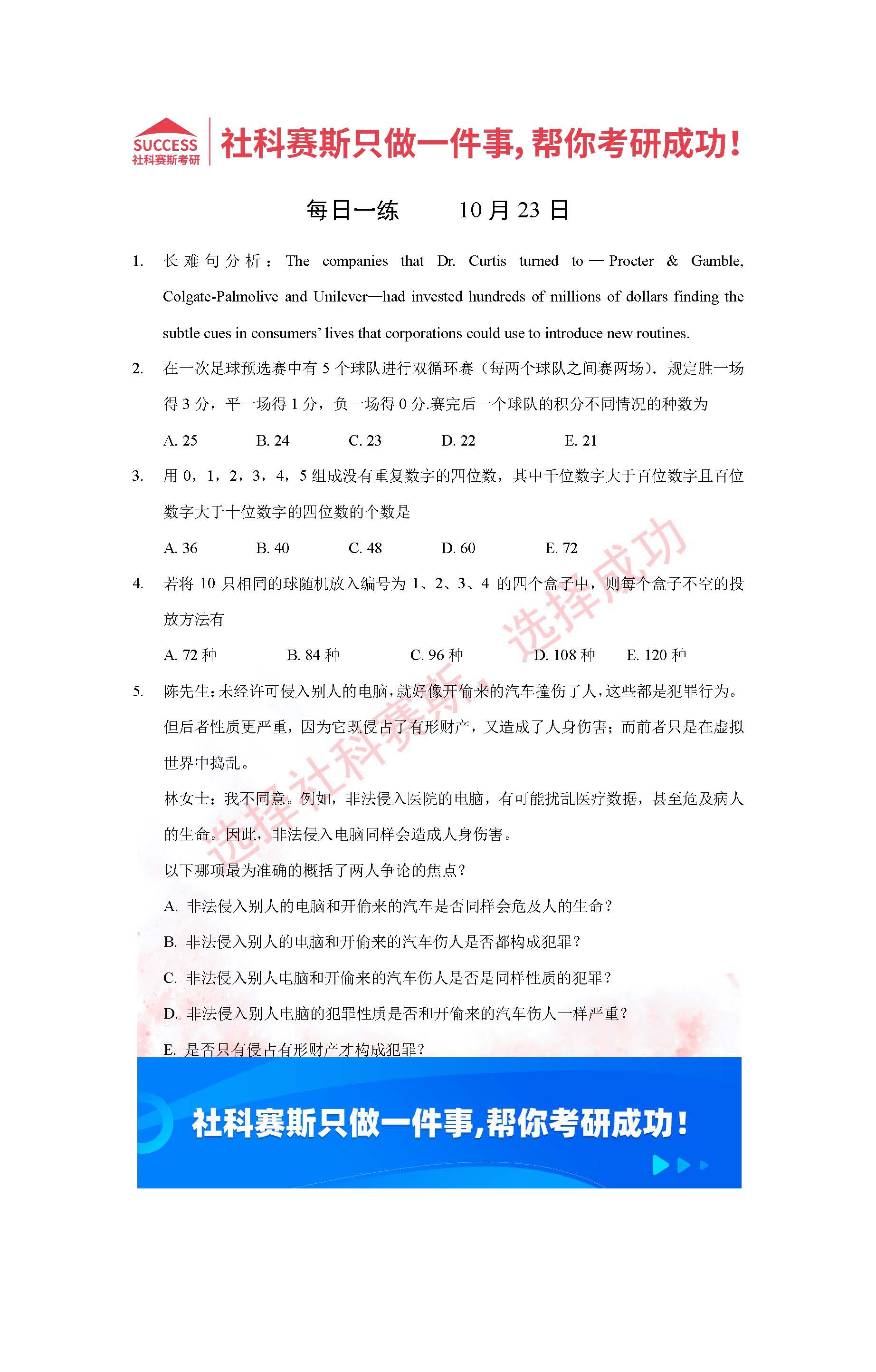 導讀:考研是一場持久戰(zhàn),保持良好的學習習慣,是能確保復習高效的關(guān)鍵。今天社科賽斯MBA備考網(wǎng)小編整理了“2022管理類聯(lián)考10月23日每日一練及答案”的內(nèi)容,希望能對廣大考生有所幫助。