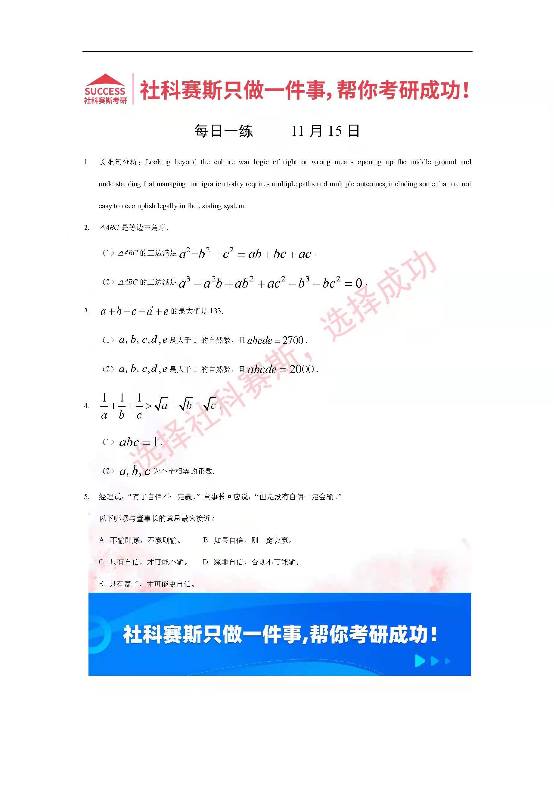 導讀:考研是一場持久戰,保持良好的學習習慣,是能確保復習高效的關鍵。今天社科賽斯MBA備考網小編整理了“2022管理類聯考11月15日每日一練及答案”的內容,希望能對廣大考生有所幫助。