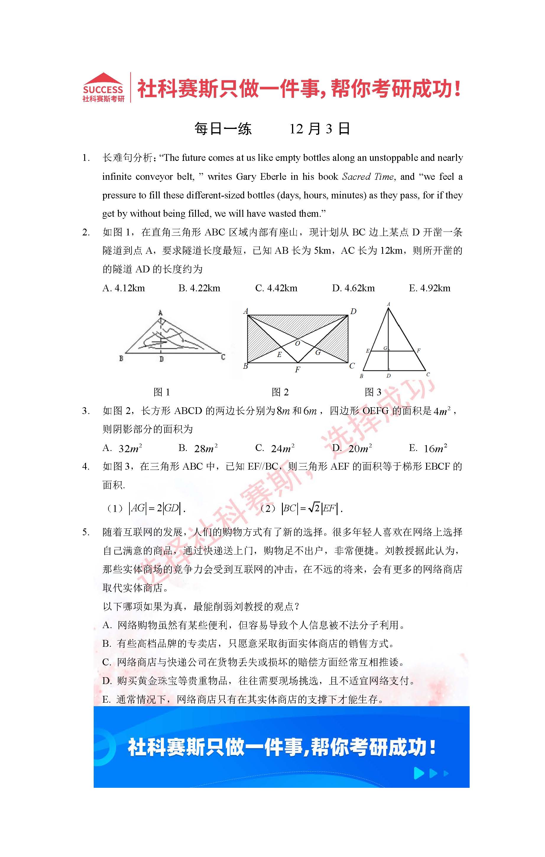 導(dǎo)讀:考研是一場(chǎng)持久戰(zhàn),保持良好的學(xué)習(xí)習(xí)慣,是能確保復(fù)習(xí)高效的關(guān)鍵。今天社科賽斯MBA備考網(wǎng)小編整理了“2022管理類聯(lián)考12月3日每日一練及答案”的內(nèi)容,希望能對(duì)廣大考生有所幫助。