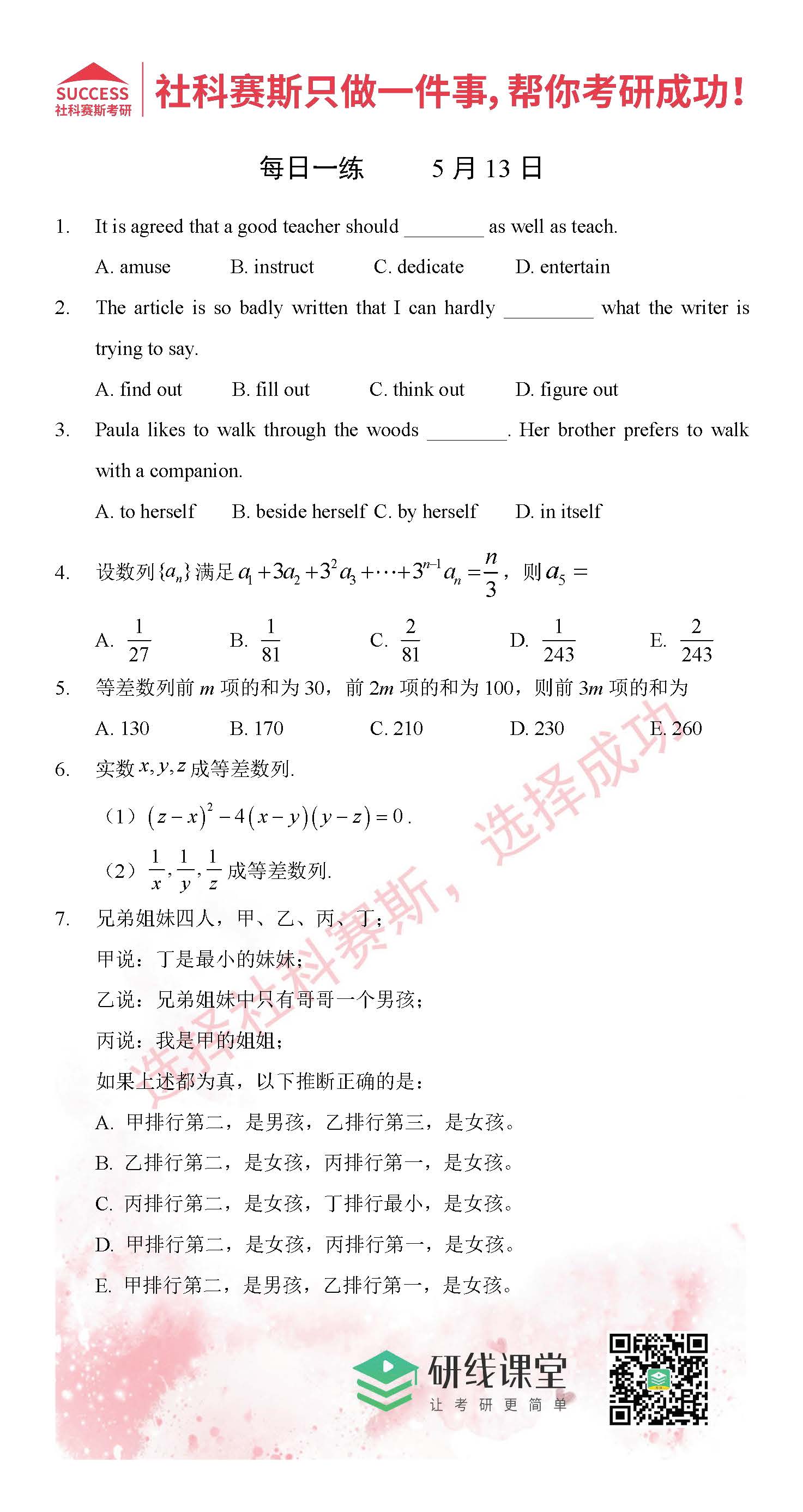 考研是一場持久戰(zhàn),保持良好的學習習慣,是能確保復習高效的關鍵。MBA備考網(wǎng)小編整理了管綜的每日一練,希望能對廣大考生有所幫助。
