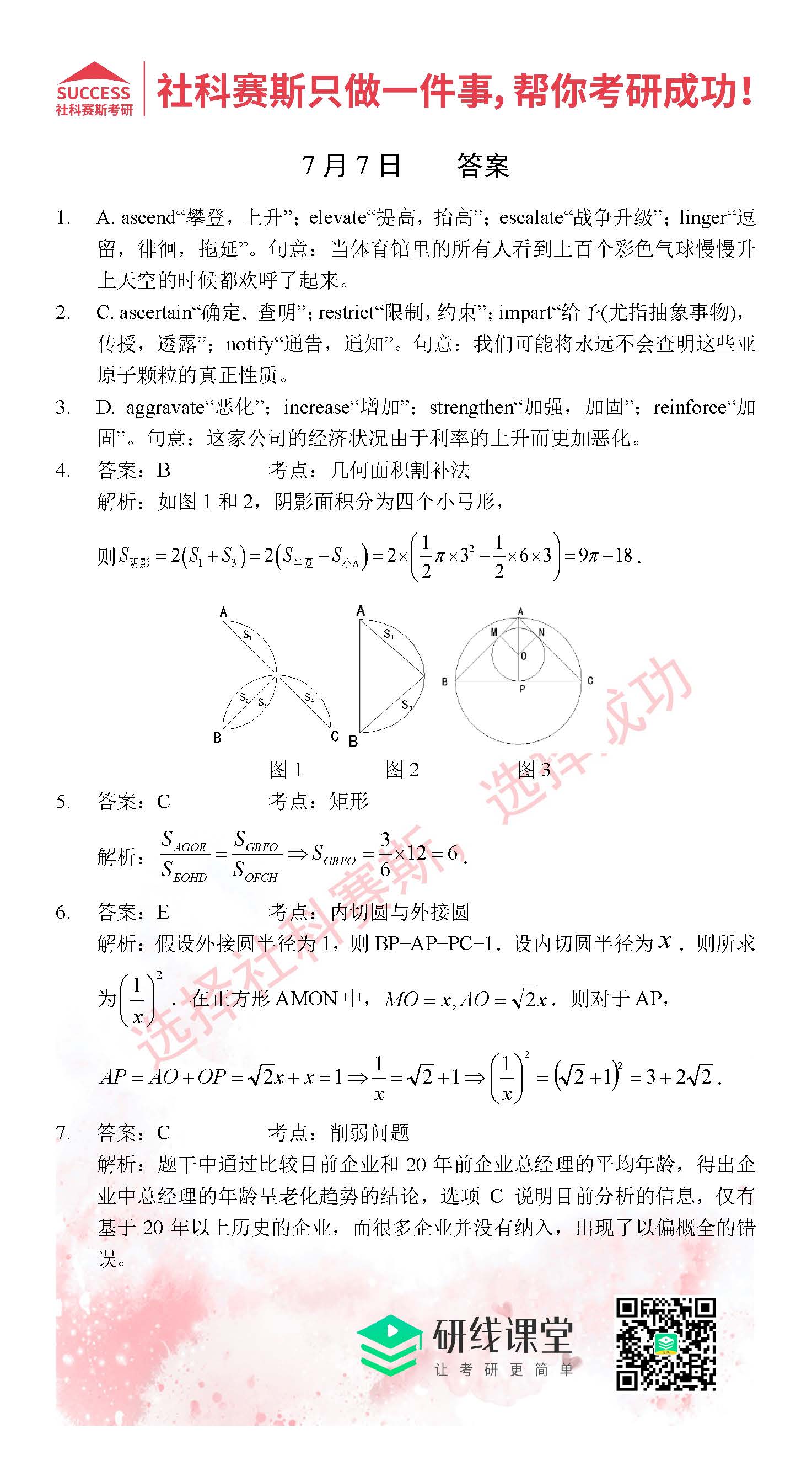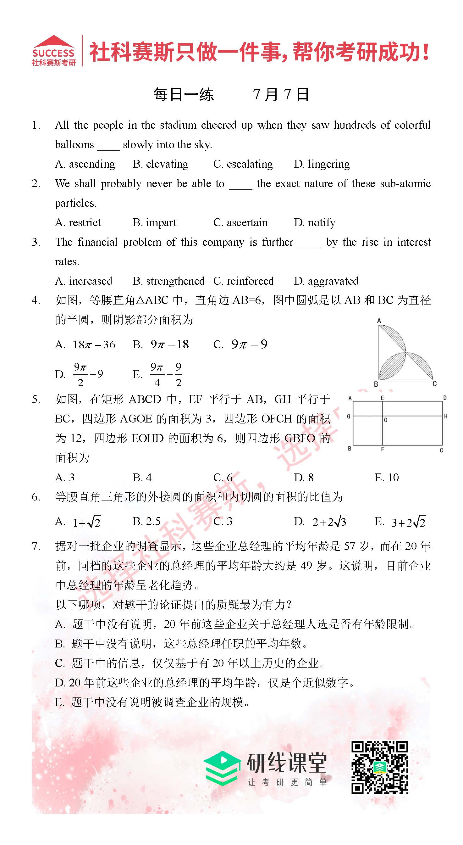 以上就是MBA備考網小編為大家提供的今日的每日一練“2021管理類聯考7月7日每日一練及答案”的全部內容,希望各位考生堅持利用起來,更多每日一練內容請持續關注MBA備考網管理類聯考每日一練。