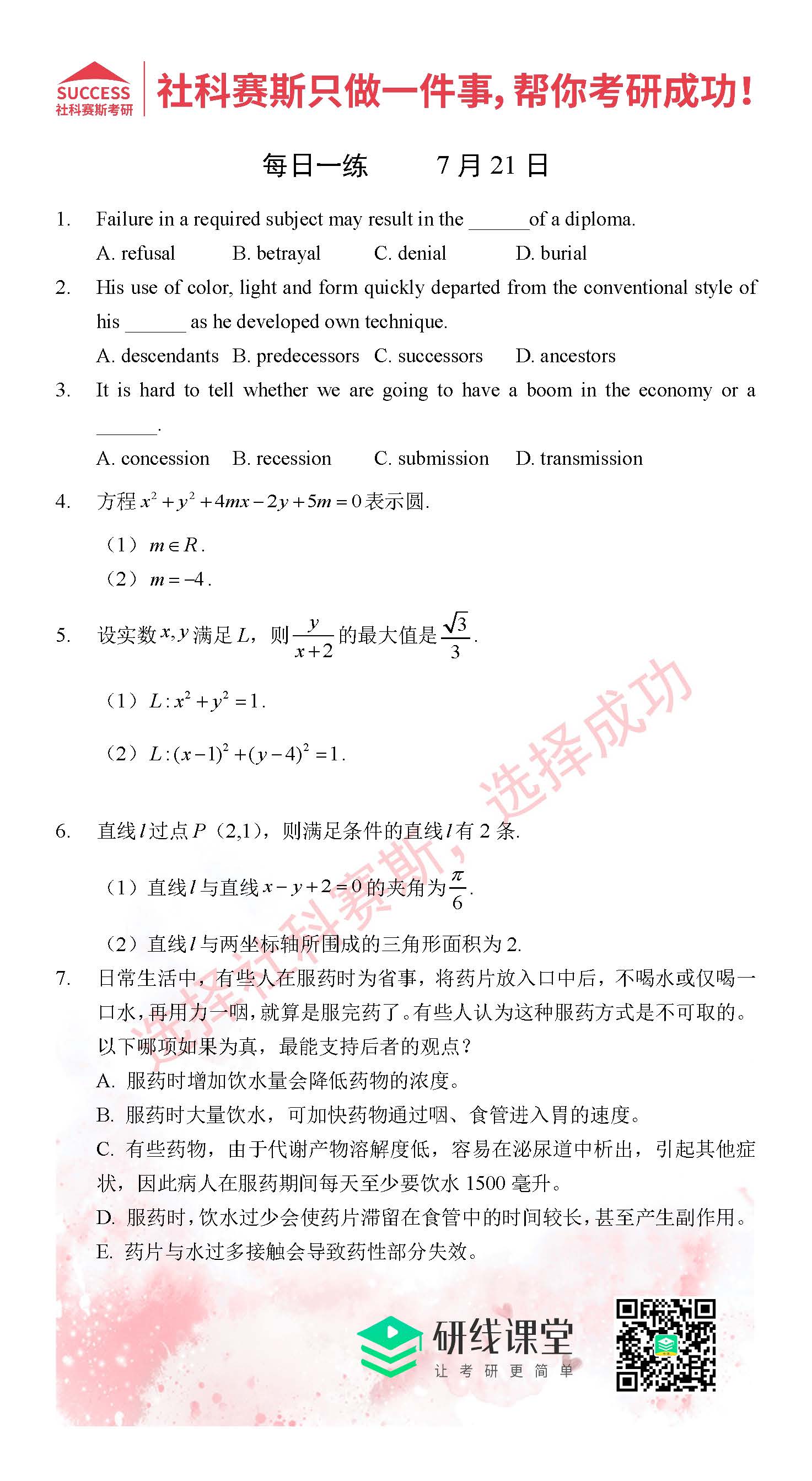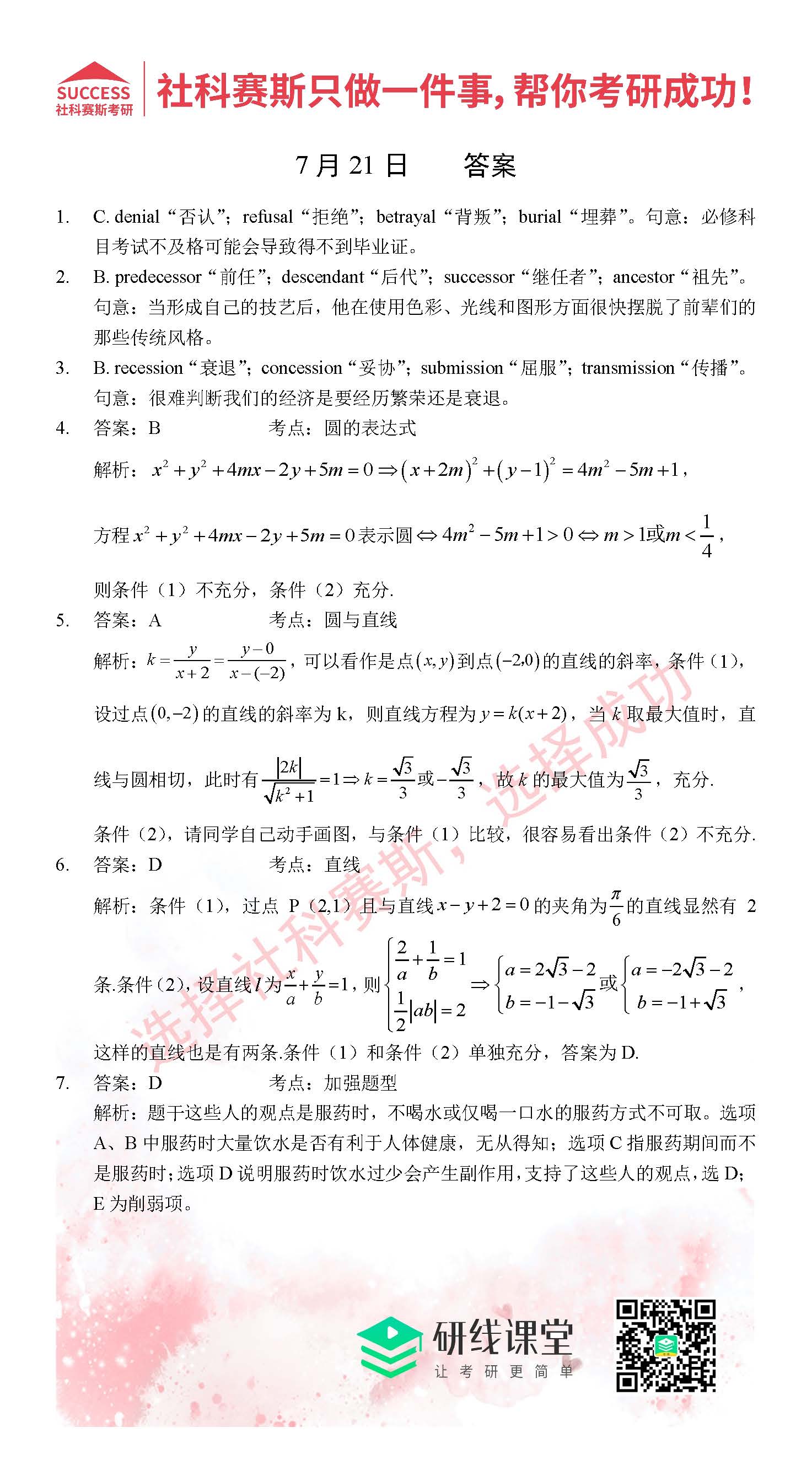 以上就是MBA備考網小編為大家提供的今日的每日一練“2021管理類聯考7月21日每日一練及答案”的全部內容,希望各位考生堅持利用起來,更多每日一練內容請持續關注MBA備考網管理類聯考每日一練。
