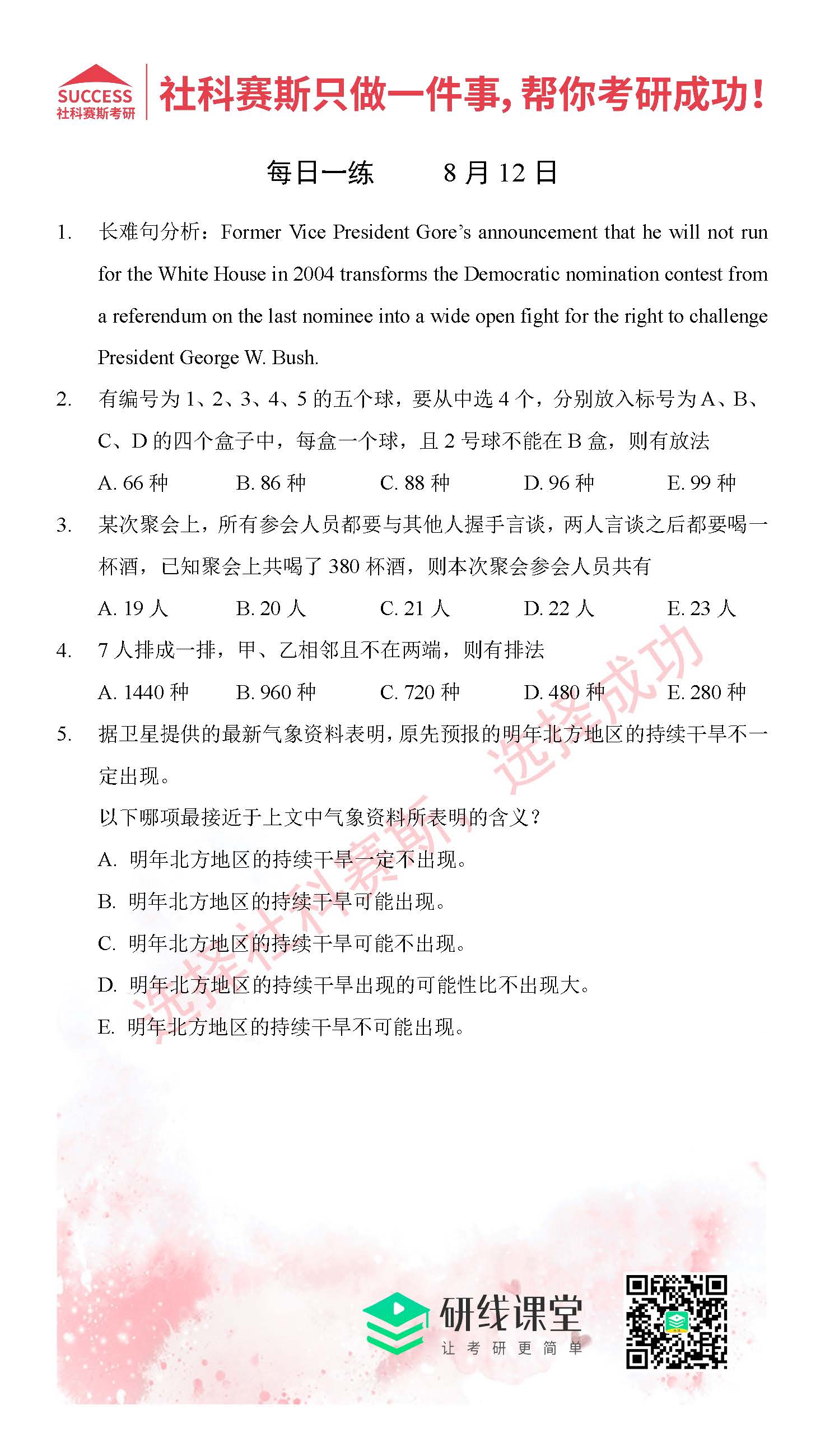 以上就是MBA備考網小編為大家提供的今日每日一練“2021管理類聯考8月12日每日一練及答案”的全部內容,希望各位考生堅持利用起來,更多每日一練內容請持續關注MBA備考網管理類聯考每日一練。