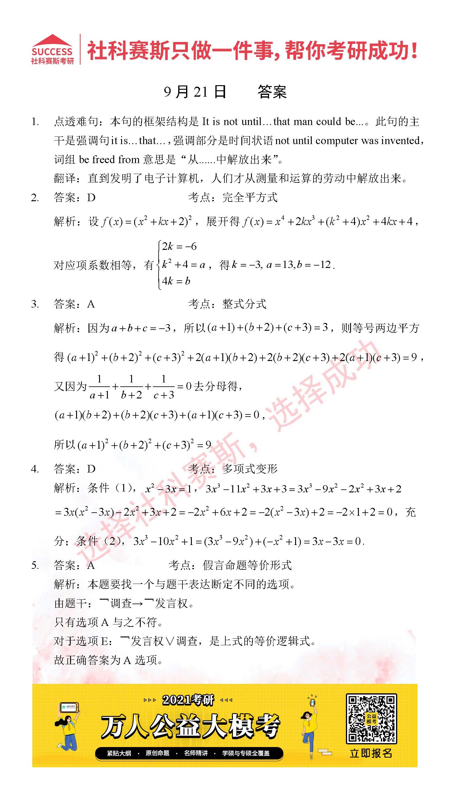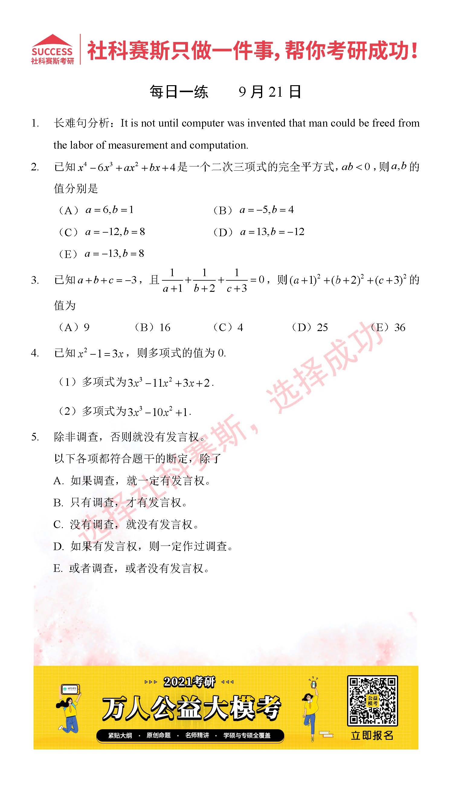 考研是一場持久戰,保持良好的學習習慣,是能確保復習高效的關鍵。今天社科賽斯MBA備考網小編整理了“2021管理類聯考9月21日每日一練及答案”的內容,希望能對廣大考生有所幫助。
