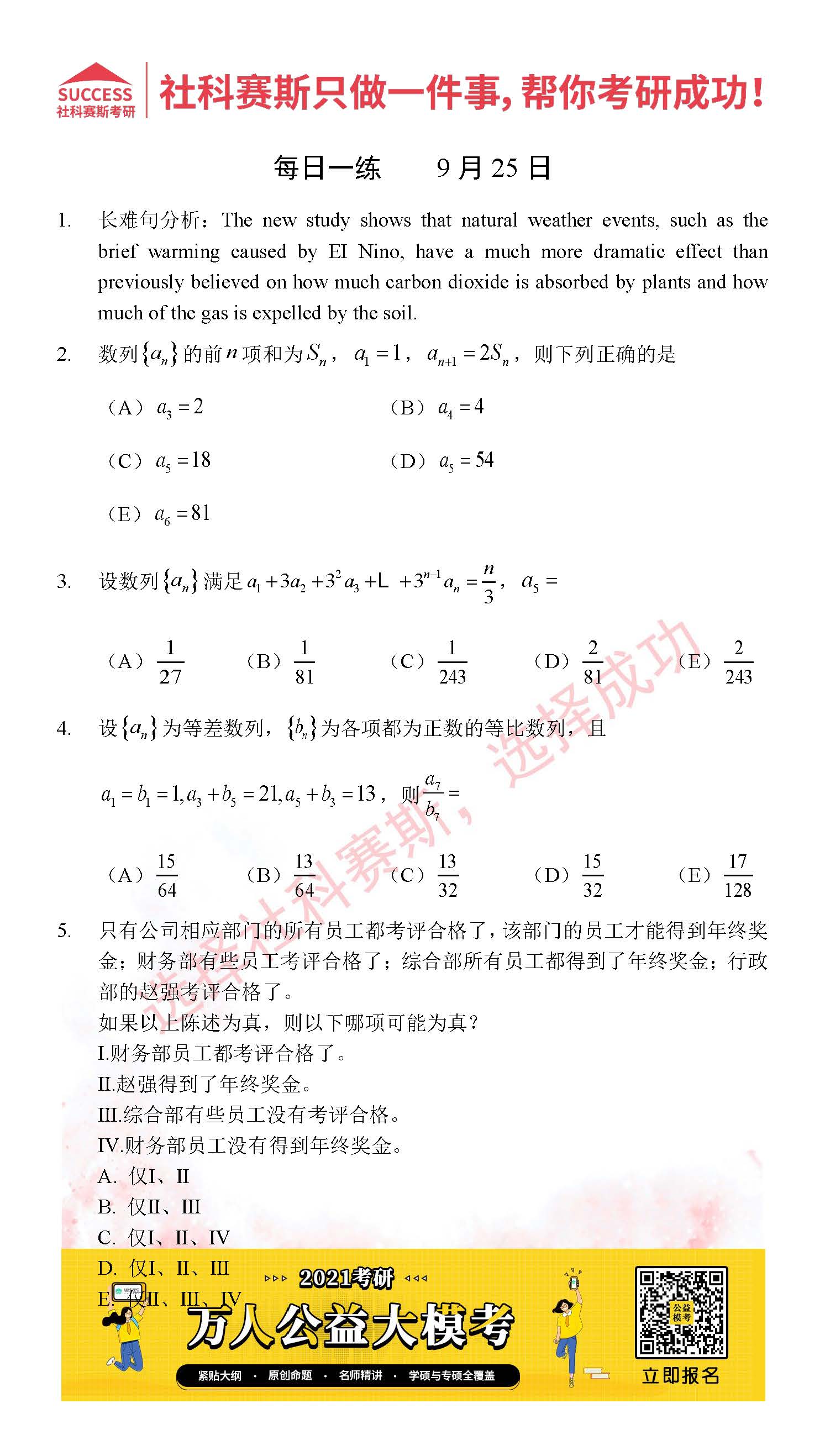 考研是一場持久戰(zhàn),保持良好的學(xué)習(xí)習(xí)慣,是能確保復(fù)習(xí)高效的關(guān)鍵。今天社科賽斯MBA備考網(wǎng)小編整理了“2021管理類聯(lián)考9月25日每日一練及答案”的內(nèi)容,希望能對廣大考生有所幫助。
