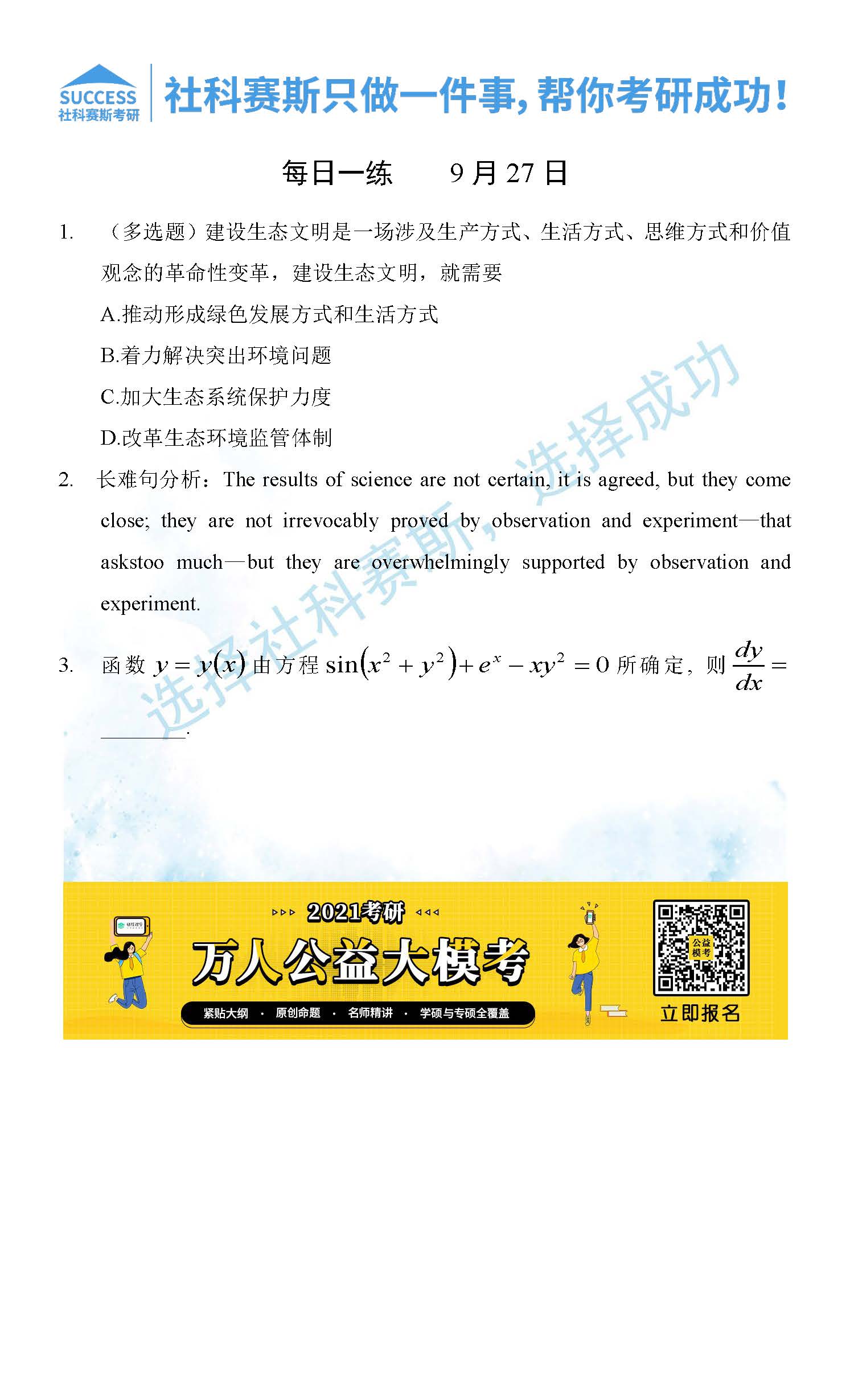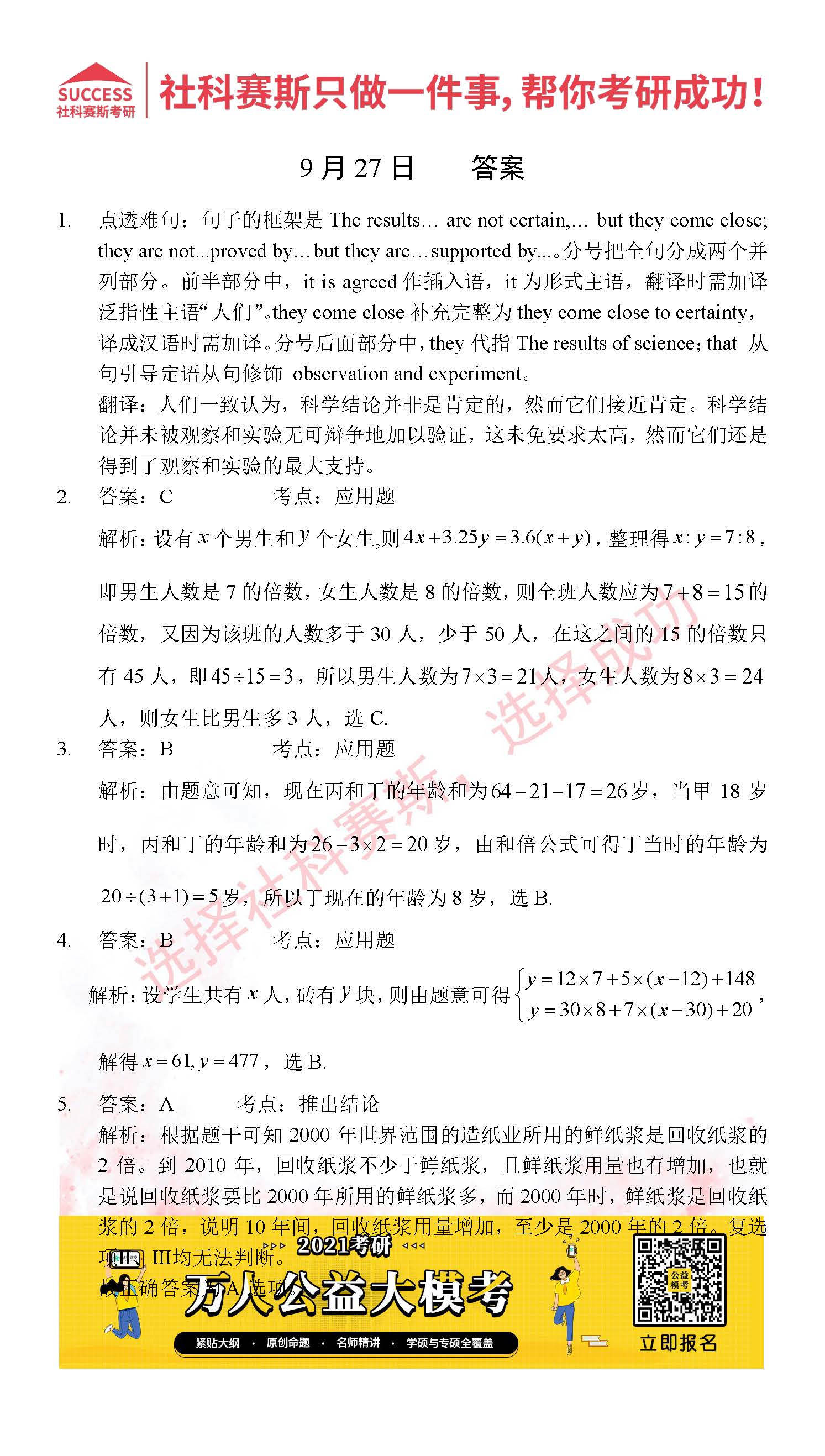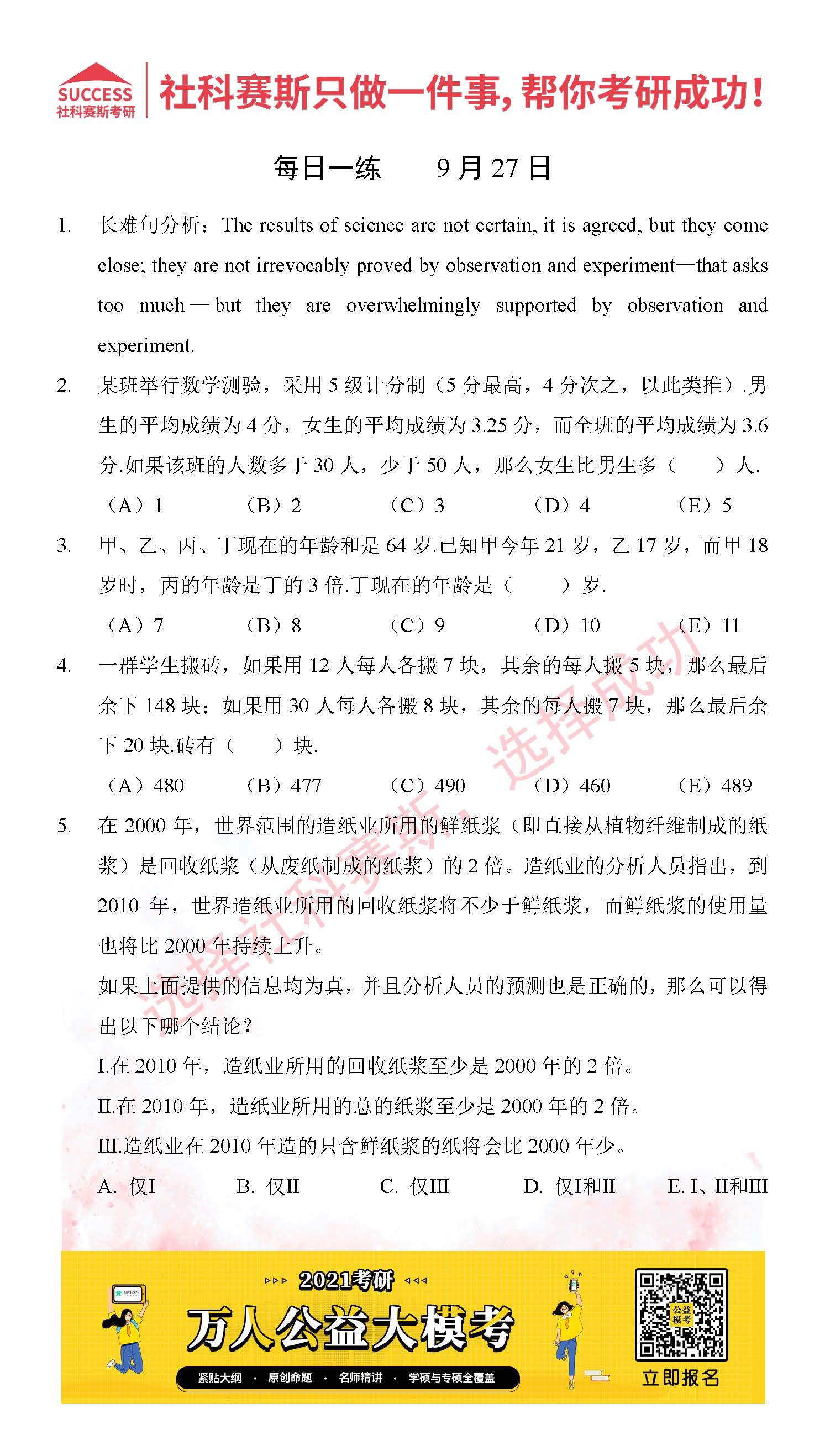 考研是一場(chǎng)持久戰(zhàn),保持良好的學(xué)習(xí)習(xí)慣,是能確保復(fù)習(xí)高效的關(guān)鍵。今天社科賽斯MBA備考網(wǎng)小編整理了“2021管理類聯(lián)考9月27日每日一練及答案”的內(nèi)容,希望能對(duì)廣大考生有所幫助。