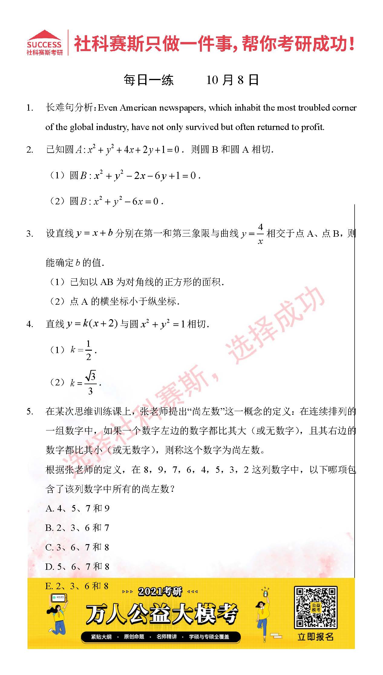 考研是一場持久戰,保持良好的學習習慣,是能確保復習高效的關鍵。今天社科賽斯MBA備考網小編整理了“2021管理類聯考10月8日每日一練及答案”的內容,希望能對廣大考生有所幫助。