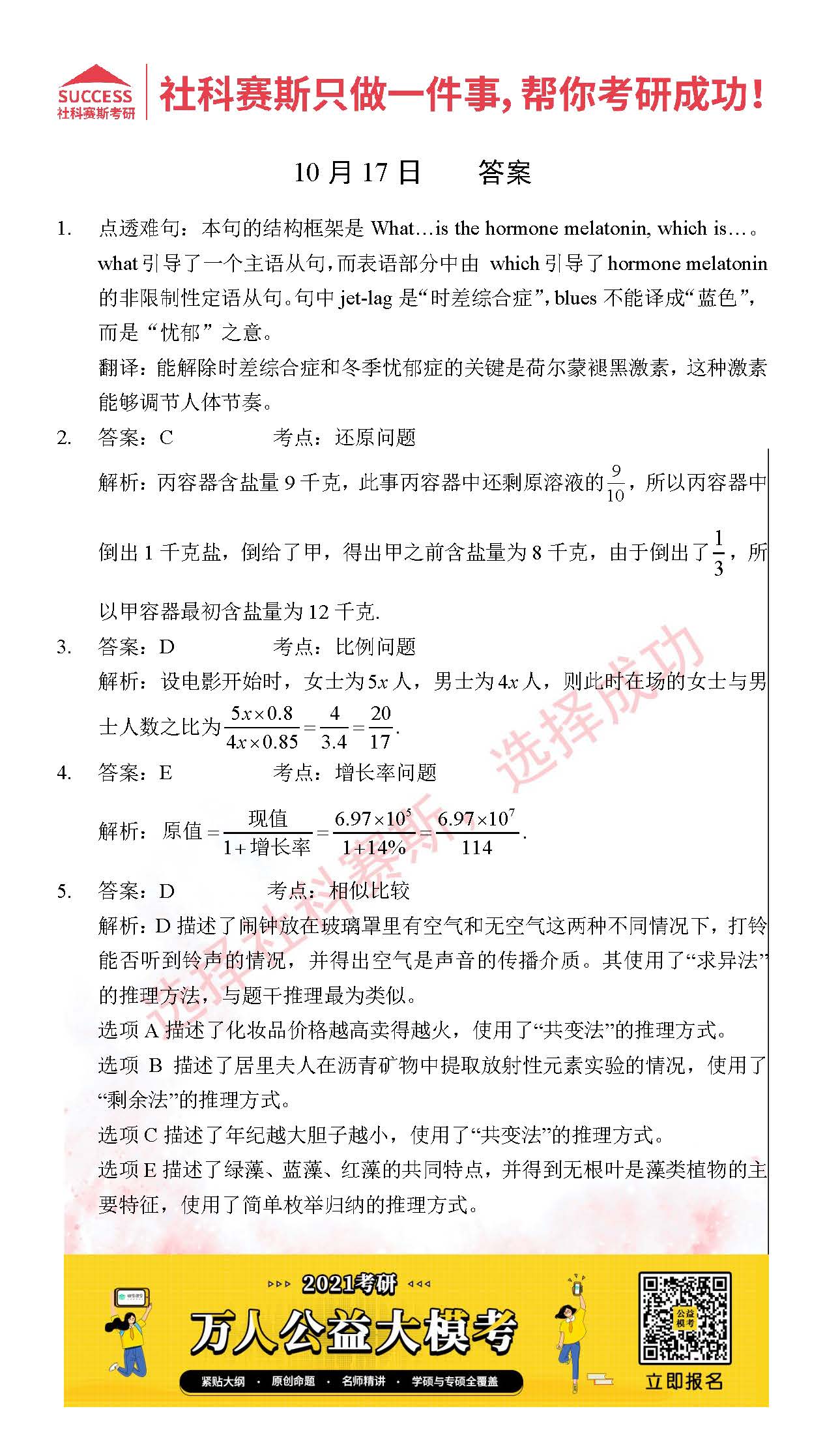 考研是一場持久戰,保持良好的學習習慣,是能確保復習高效的關鍵。今天社科賽斯MBA備考網小編整理了“2021管理類聯考10月17日每日一練及答案”的內容,希望能對廣大考生有所幫助。