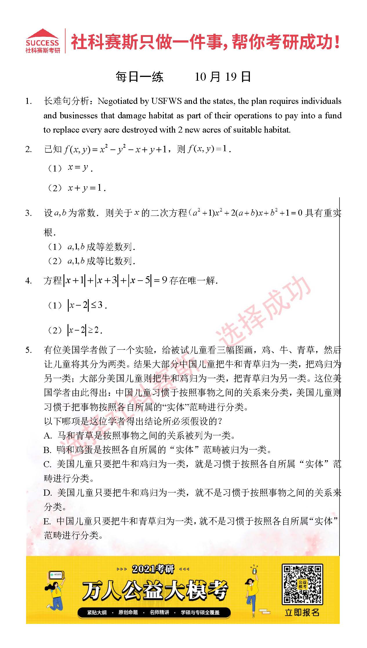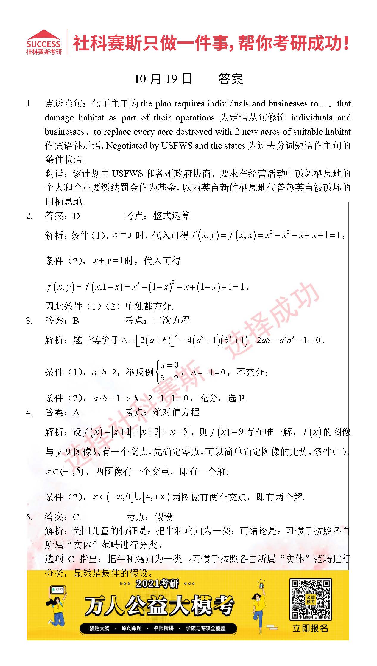 考研是一場(chǎng)持久戰(zhàn),保持良好的學(xué)習(xí)習(xí)慣,是能確保復(fù)習(xí)高效的關(guān)鍵。今天社科賽斯MBA備考網(wǎng)小編整理了“2021管理類聯(lián)考10月19日每日一練及答案”的內(nèi)容,希望能對(duì)廣大考生有所幫助。