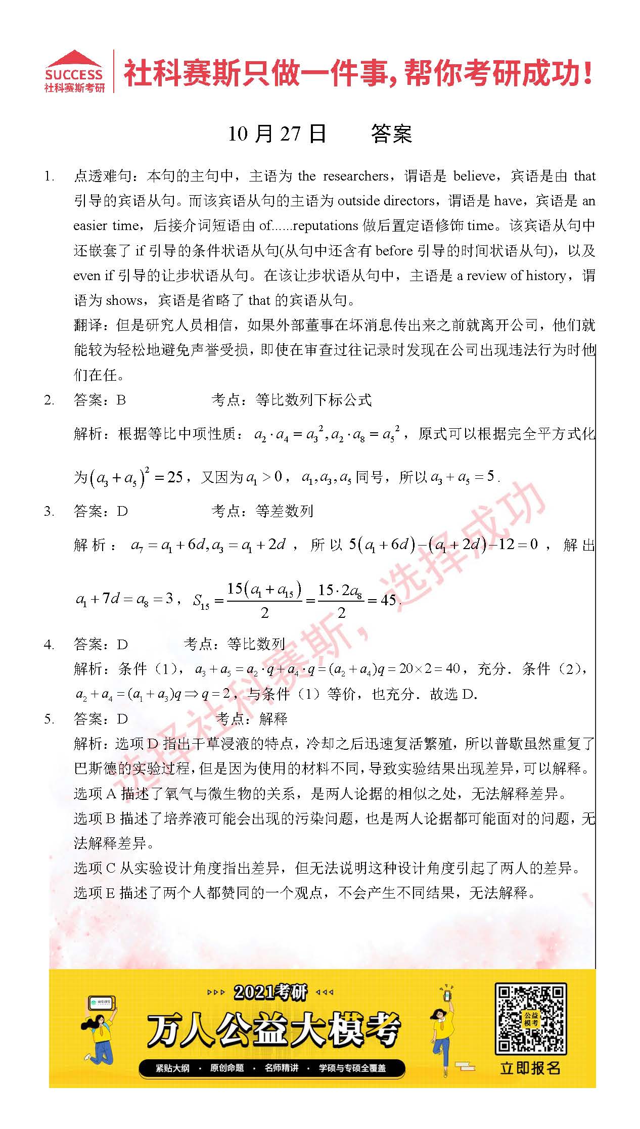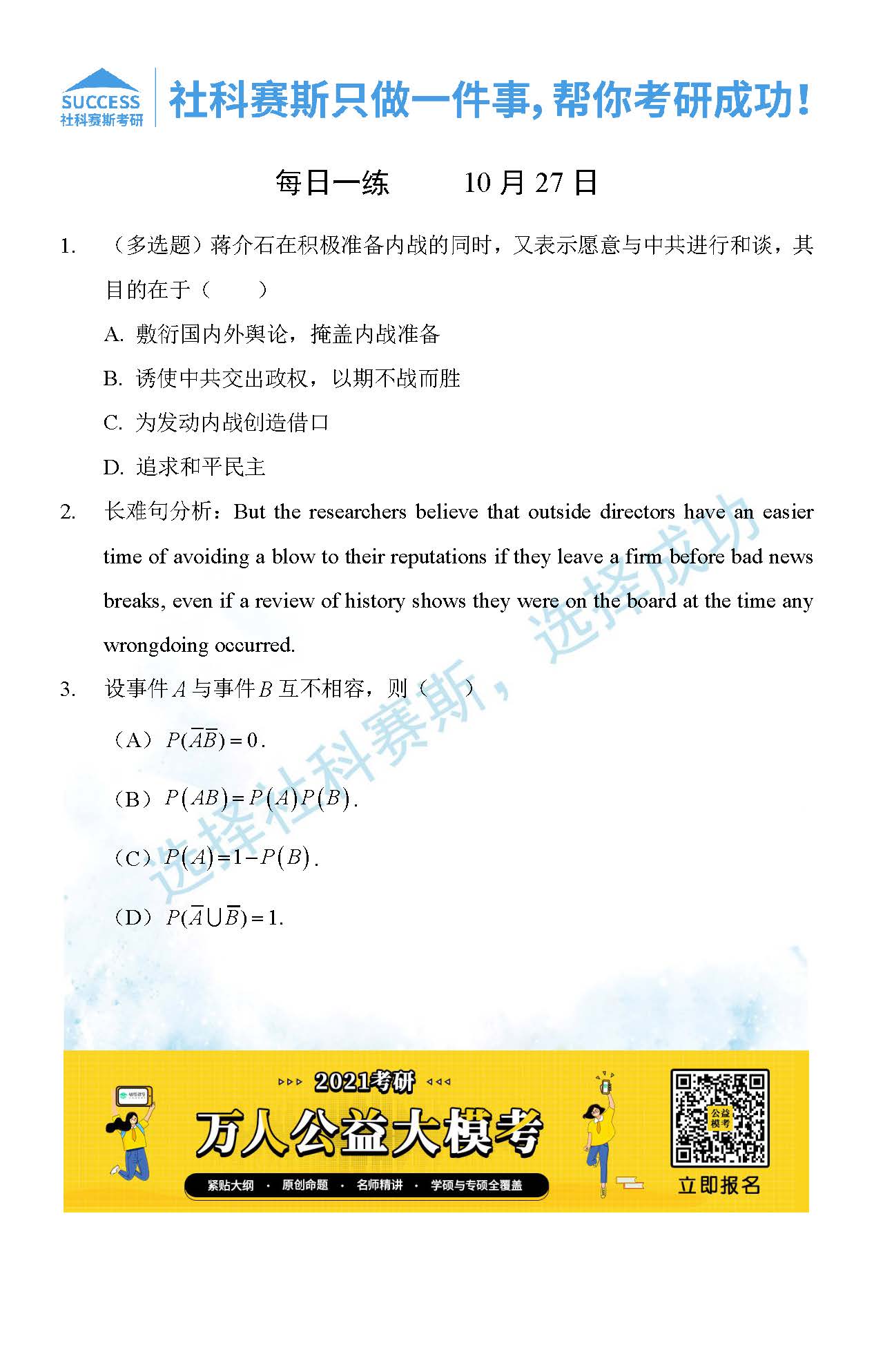 考研是一場持久戰,保持良好的學習習慣,是能確保復習高效的關鍵。今天社科賽斯MBA備考網小編整理了“2021管理類聯10月27日每日一練及答案”的內容,希望能對廣大考生有所幫助。