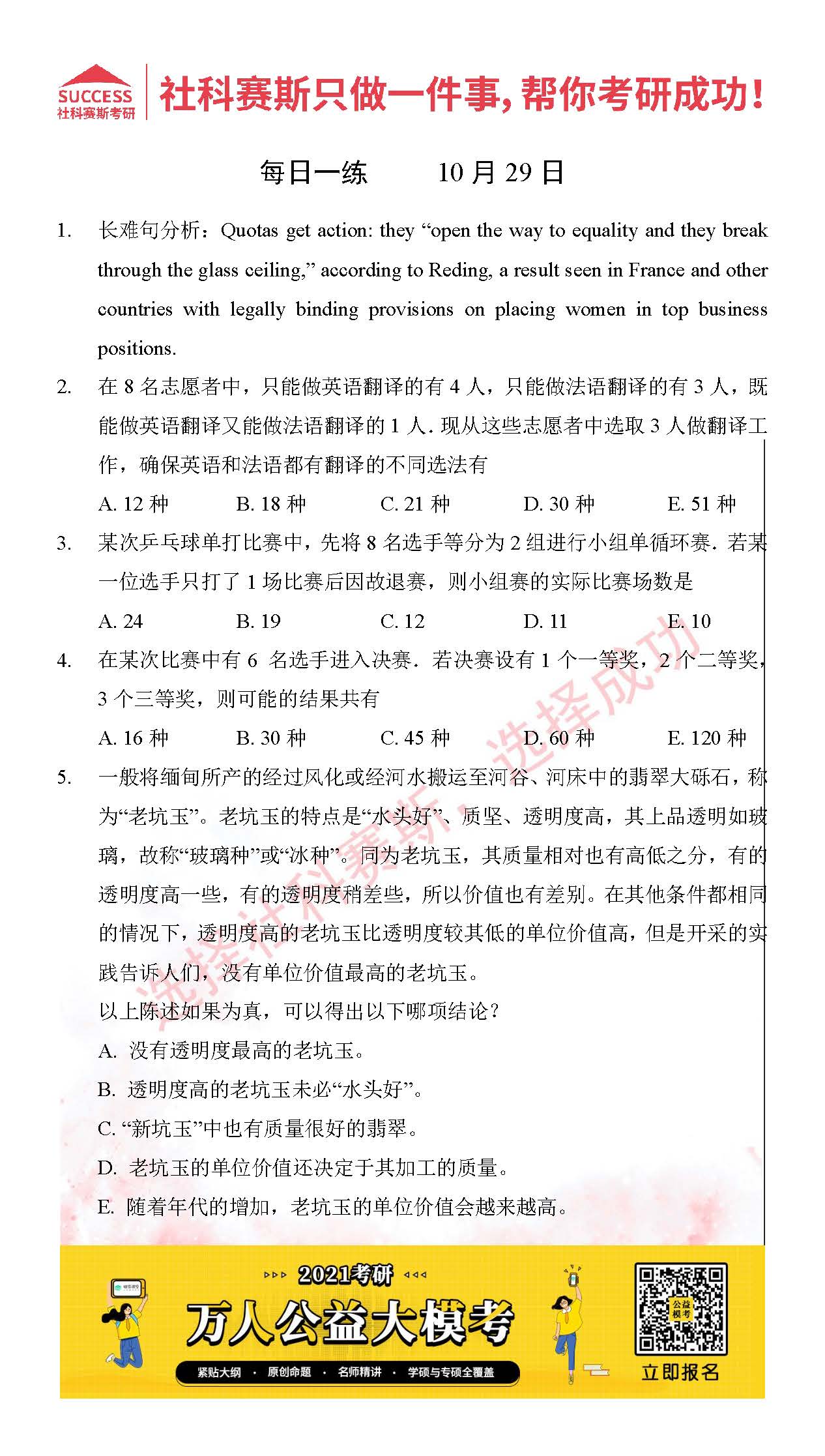 考研是一場持久戰,保持良好的學習習慣,是能確保復習高效的關鍵。今天社科賽斯MBA備考網小編整理了“2021管理類聯10月29日每日一練及答案”的內容,希望能對廣大考生有所幫助。