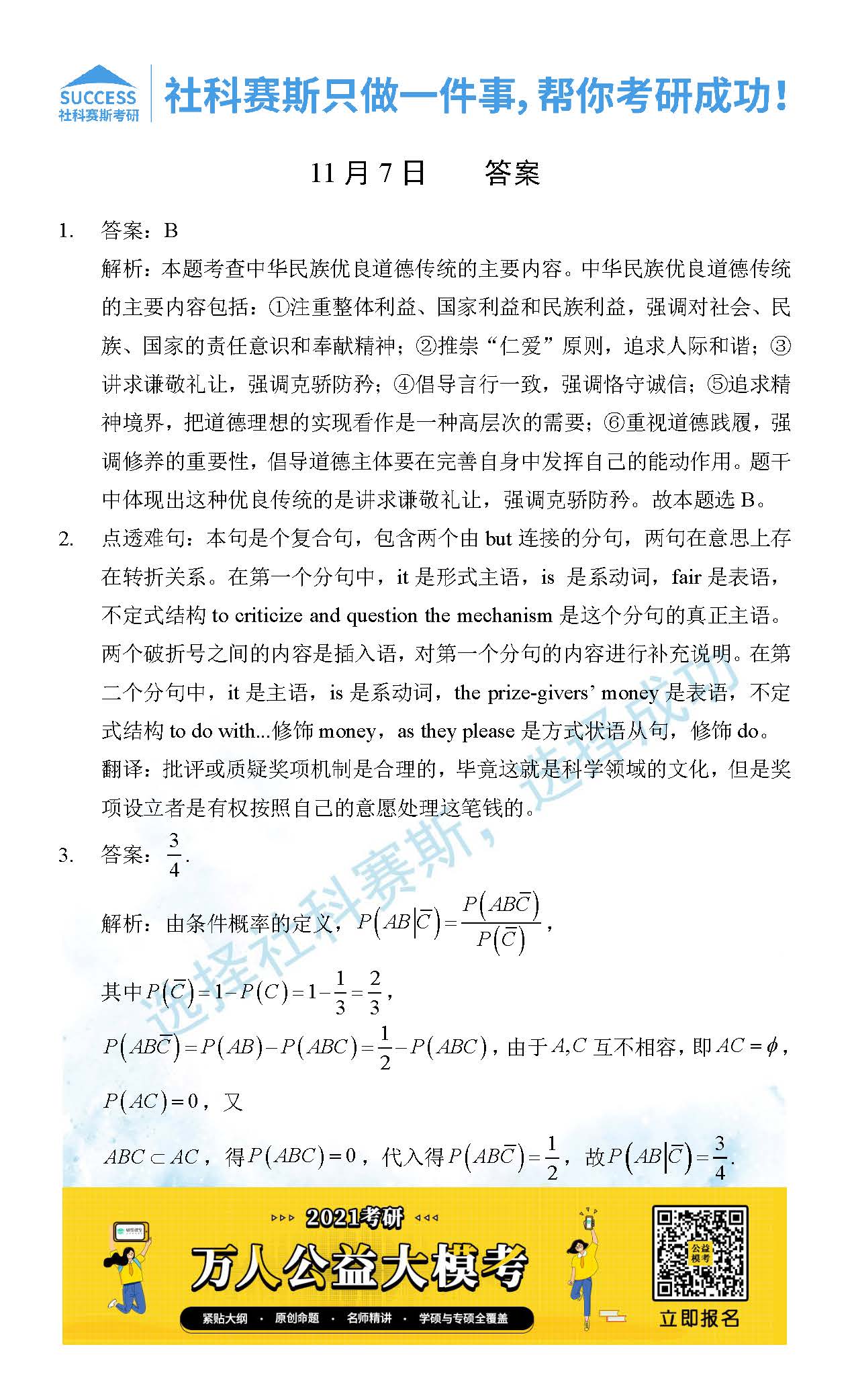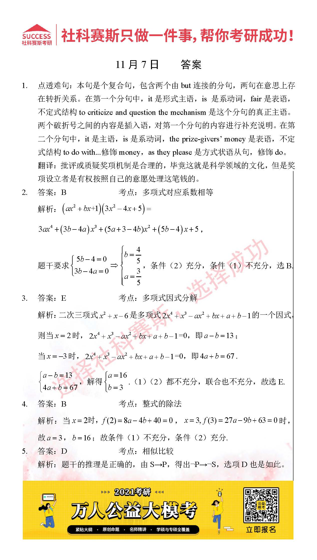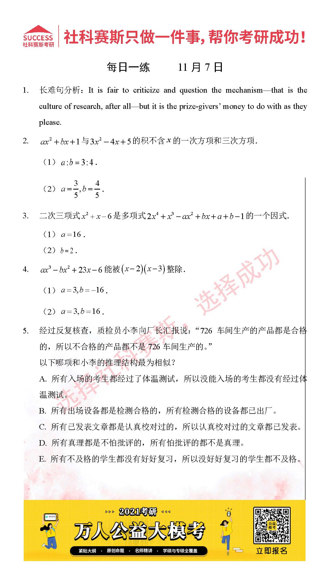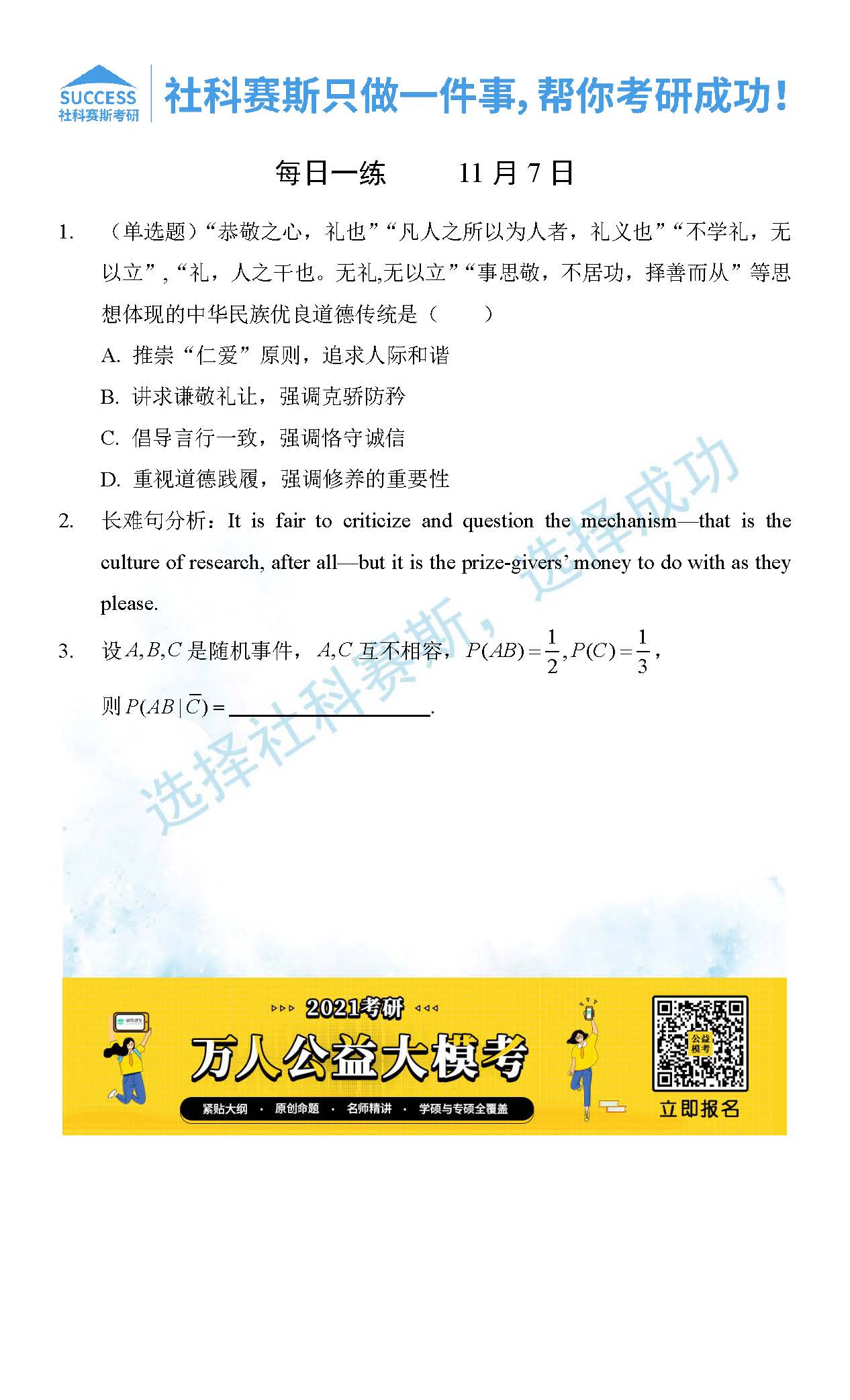 考研是一場持久戰(zhàn),保持良好的學習習慣,是能確保復習高效的關鍵。今天社科賽斯MBA備考網(wǎng)小編整理了“2021管理類聯(lián)11月7日每日一練及答案”的內(nèi)容,希望能對廣大考生有所幫助。