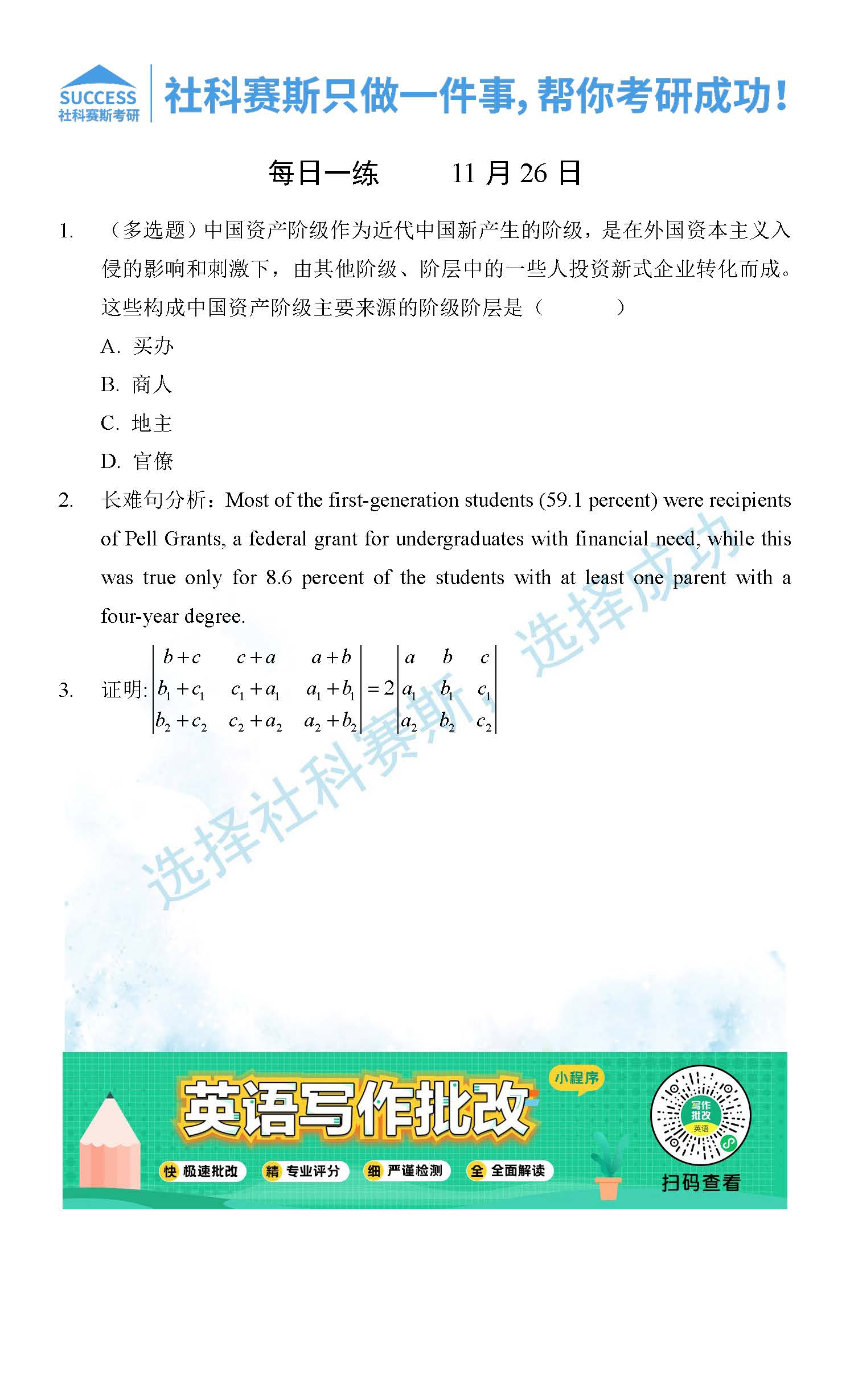 考研是一場持久戰(zhàn),保持良好的學習習慣,是能確保復習高效的關(guān)鍵。今天社科賽斯MBA備考網(wǎng)小編整理了“2021管理類聯(lián)11月26日每日一練及答案”的內(nèi)容,希望能對廣大考生有所幫助。