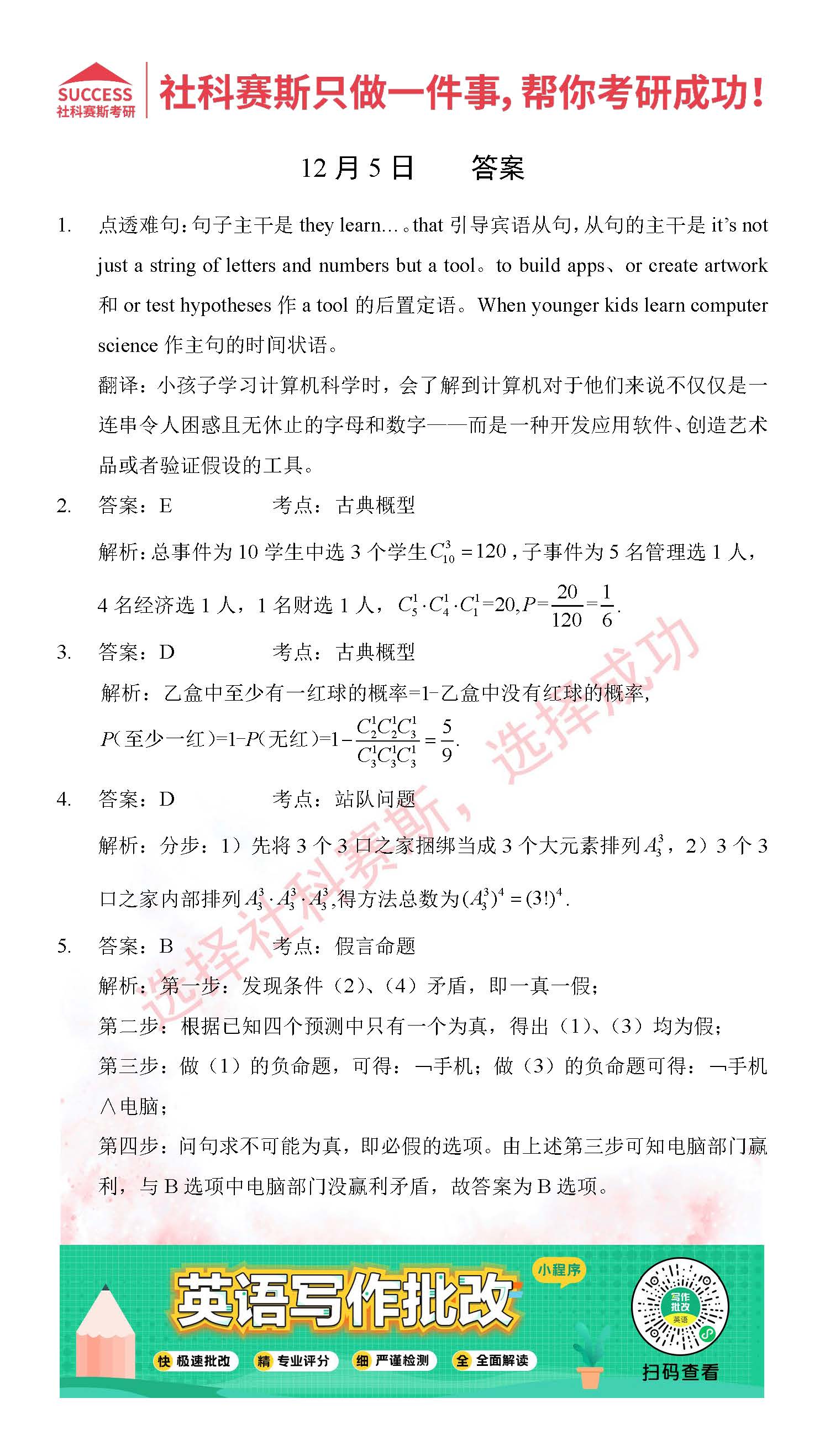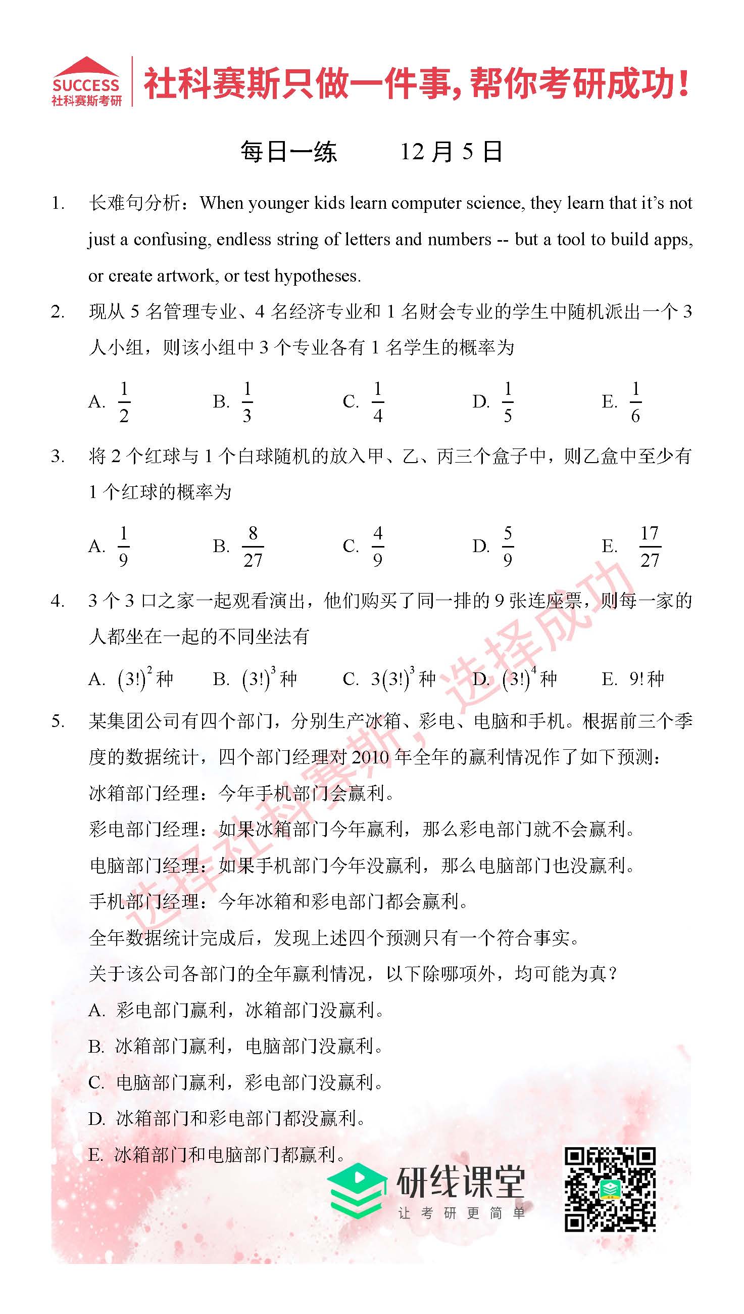 導讀:考研是一場持久戰,保持良好的學習習慣,是能確保復習高效的關鍵。今天社科賽斯MBA備考網小編整理了“2021管理類聯12月5日每日一練及答案”的內容,希望能對廣大考生有所幫助。