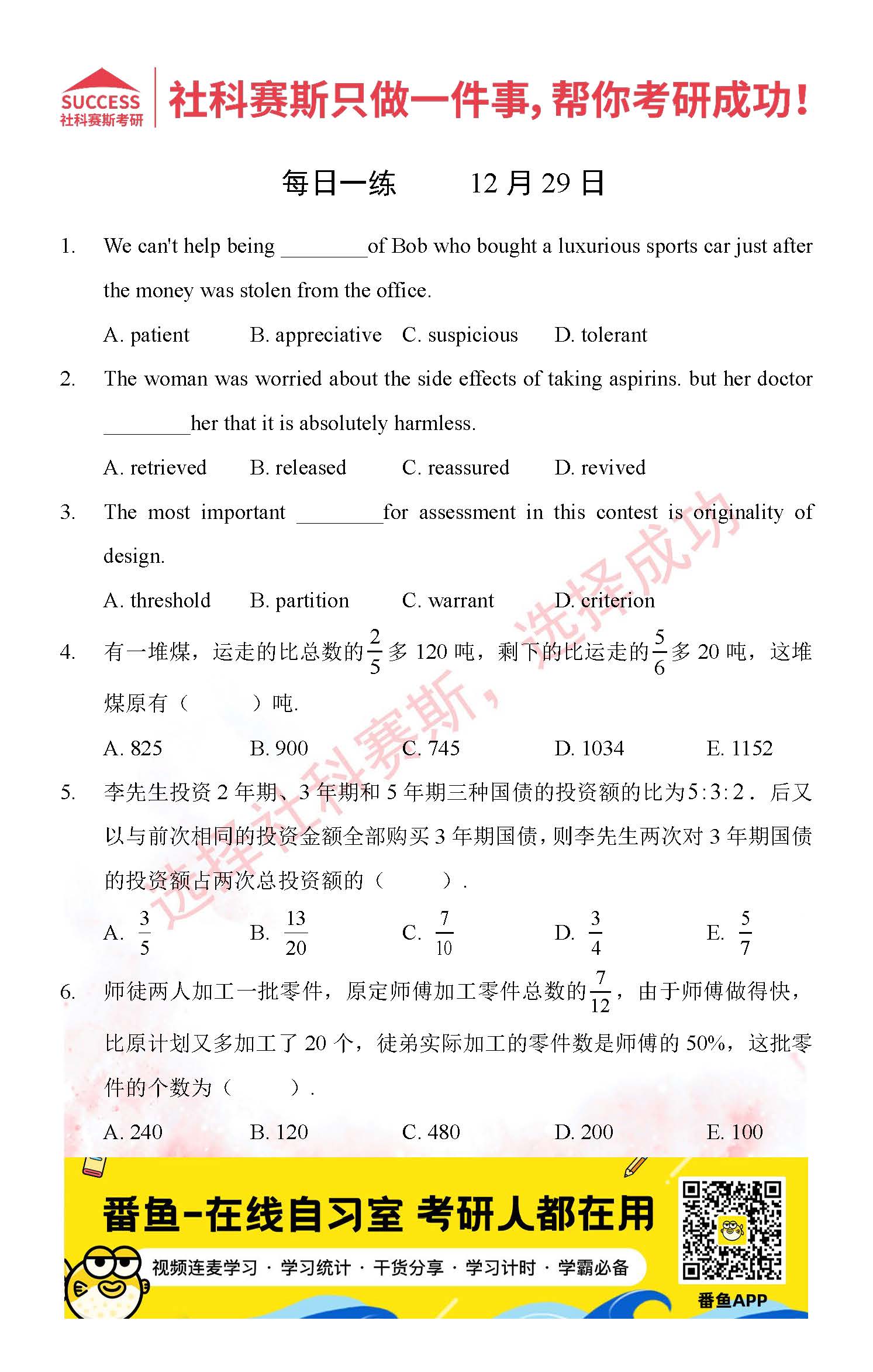 導讀:考研是一場持久戰,保持良好的學習習慣,是能確保復習高效的關鍵。今天社科賽斯MBA備考網小編整理了“2021管理類聯12月29日每日一練及答案”的內容,希望能對廣大考生有所幫助。