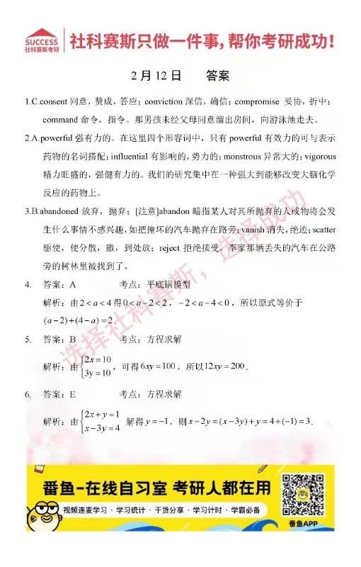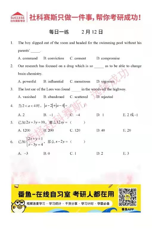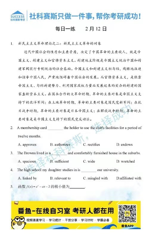 導(dǎo)讀:考研是一場持久戰(zhàn),保持良好的學(xué)習(xí)習(xí)慣,是能確保復(fù)習(xí)高效的關(guān)鍵。今天社科賽斯MBA備考網(wǎng)小編整理了“2022管理類聯(lián)2月12日每日一練及答案”的內(nèi)容,希望能對廣大考生有所幫助。