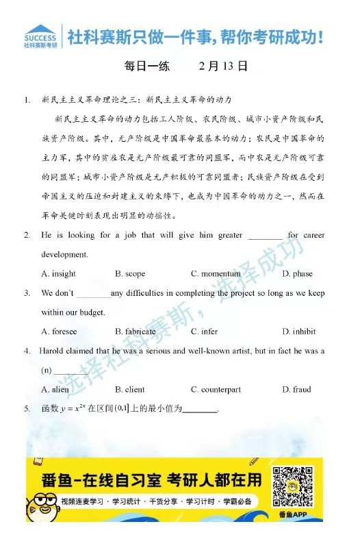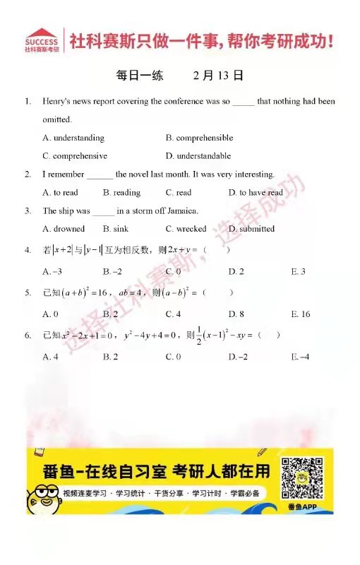 導(dǎo)讀:考研是一場(chǎng)持久戰(zhàn),保持良好的學(xué)習(xí)習(xí)慣,是能確保復(fù)習(xí)高效的關(guān)鍵。今天社科賽斯MBA備考網(wǎng)小編整理了“2022管理類聯(lián)2月13日每日一練及答案”的內(nèi)容,希望能對(duì)廣大考生有所幫助。