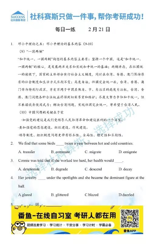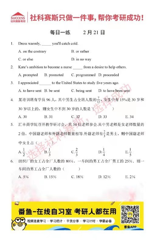 導(dǎo)讀:考研是一場(chǎng)持久戰(zhàn),保持良好的學(xué)習(xí)習(xí)慣,是能確保復(fù)習(xí)高效的關(guān)鍵。今天社科賽斯MBA備考網(wǎng)小編整理了“2022管理類聯(lián)2月21日每日一練及答案”的內(nèi)容,希望能對(duì)廣大考生有所幫助。