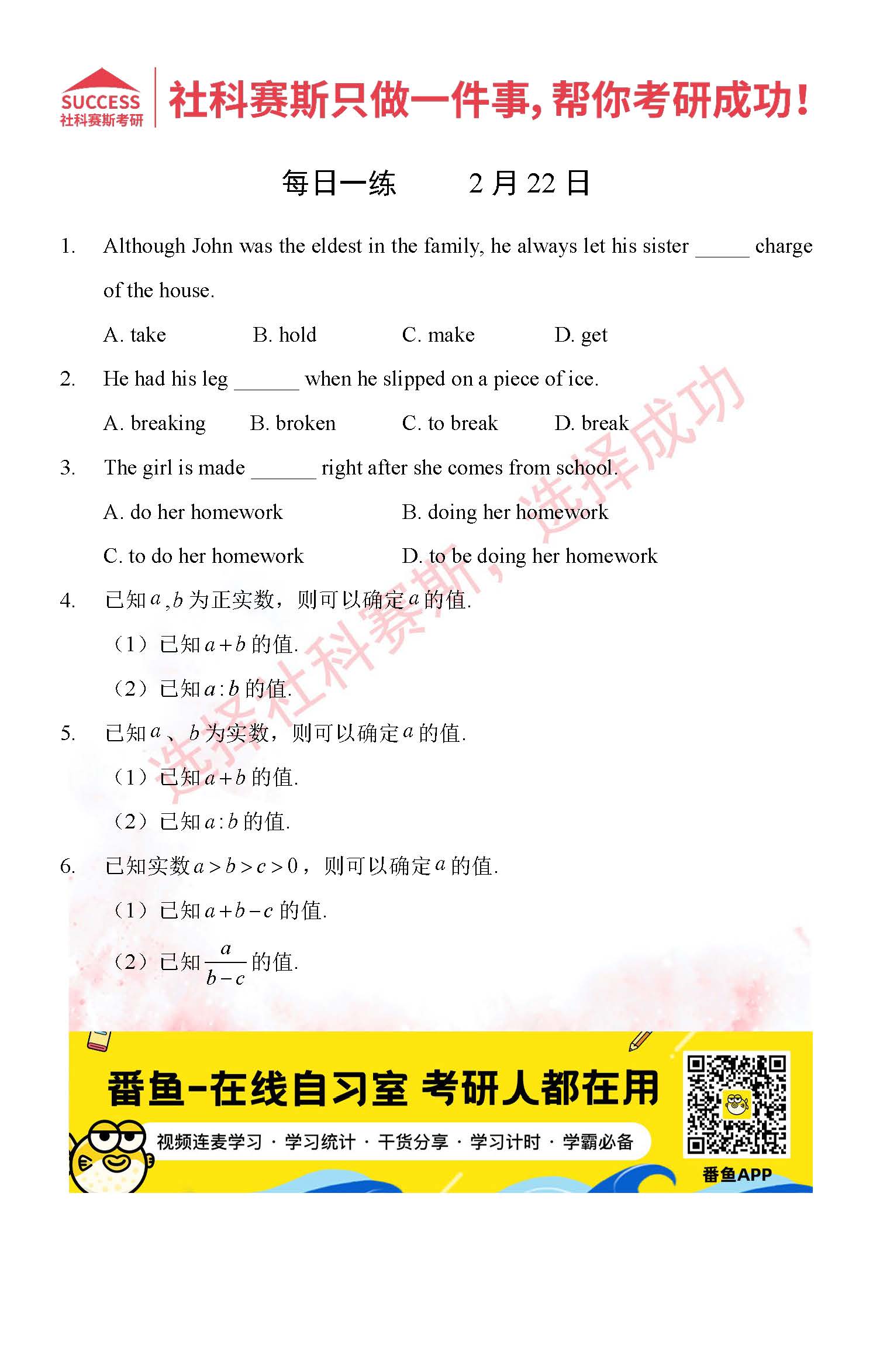 導讀:考研是一場持久戰,保持良好的學習習慣,是能確保復習高效的關鍵。今天社科賽斯MBA備考網小編整理了“2022管理類聯2月22日每日一練及答案”的內容,希望能對廣大考生有所幫助。