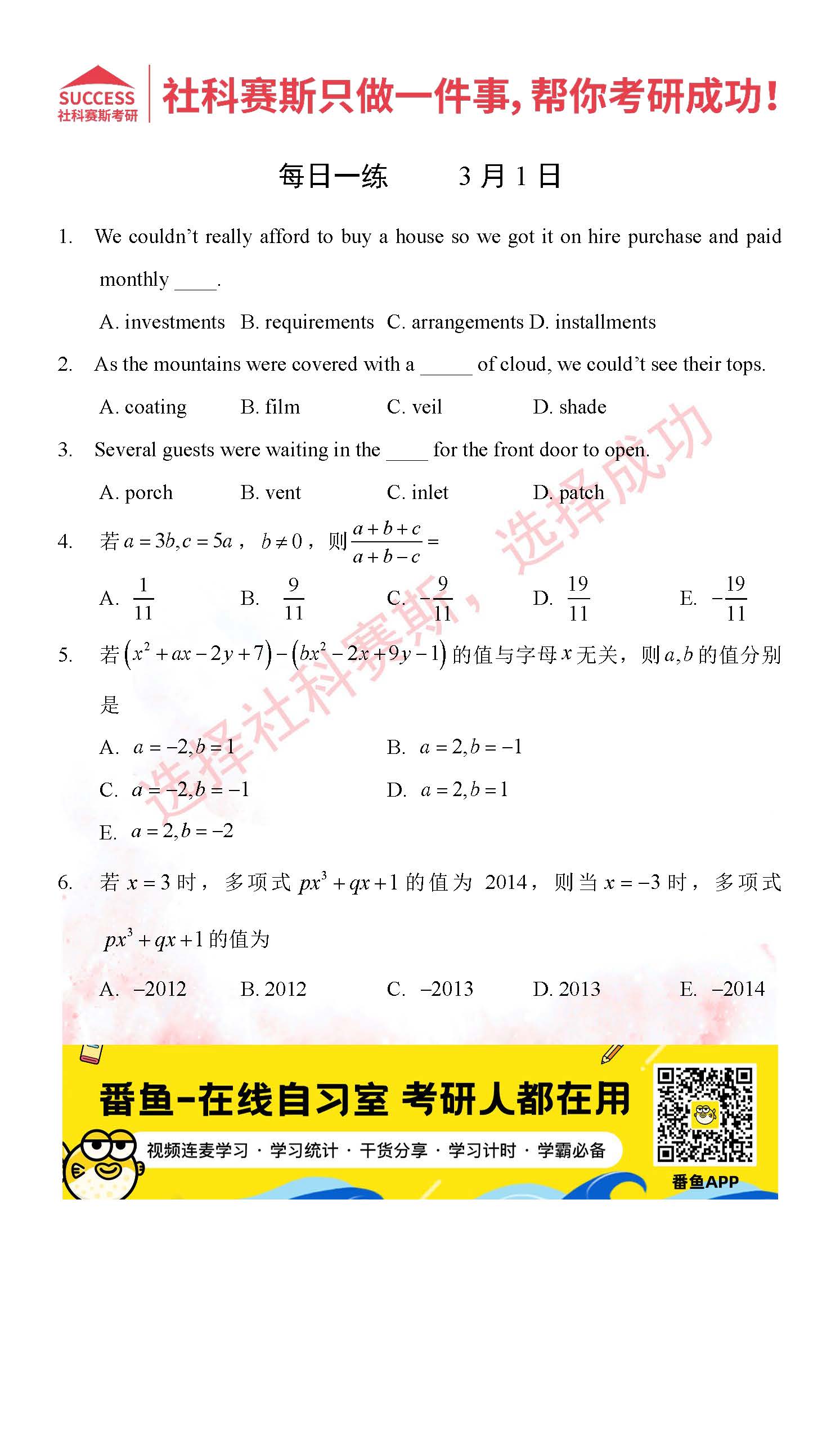 導讀:考研是一場持久戰,保持良好的學習習慣,是能確保復習高效的關鍵。今天社科賽斯MBA備考網小編整理了“2022管理類聯3月1日每日一練及答案”的內容,希望能對廣大考生有所幫助。