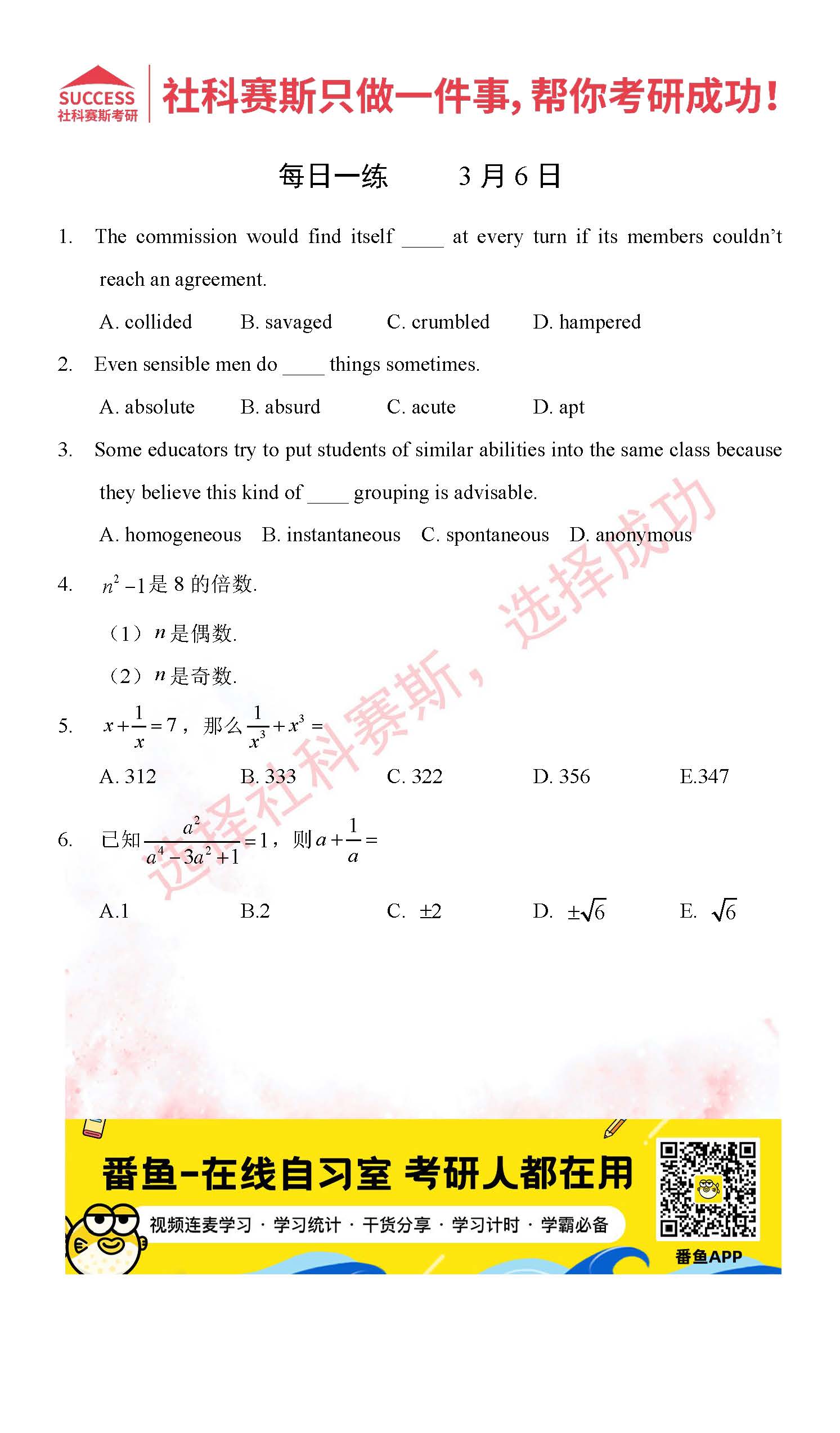 導(dǎo)讀:考研是一場持久戰(zhàn),保持良好的學(xué)習(xí)習(xí)慣,是能確保復(fù)習(xí)高效的關(guān)鍵。今天社科賽斯MBA備考網(wǎng)小編整理了“2022管理類聯(lián)3月6日每日一練及答案”的內(nèi)容,希望能對廣大考生有所幫助。