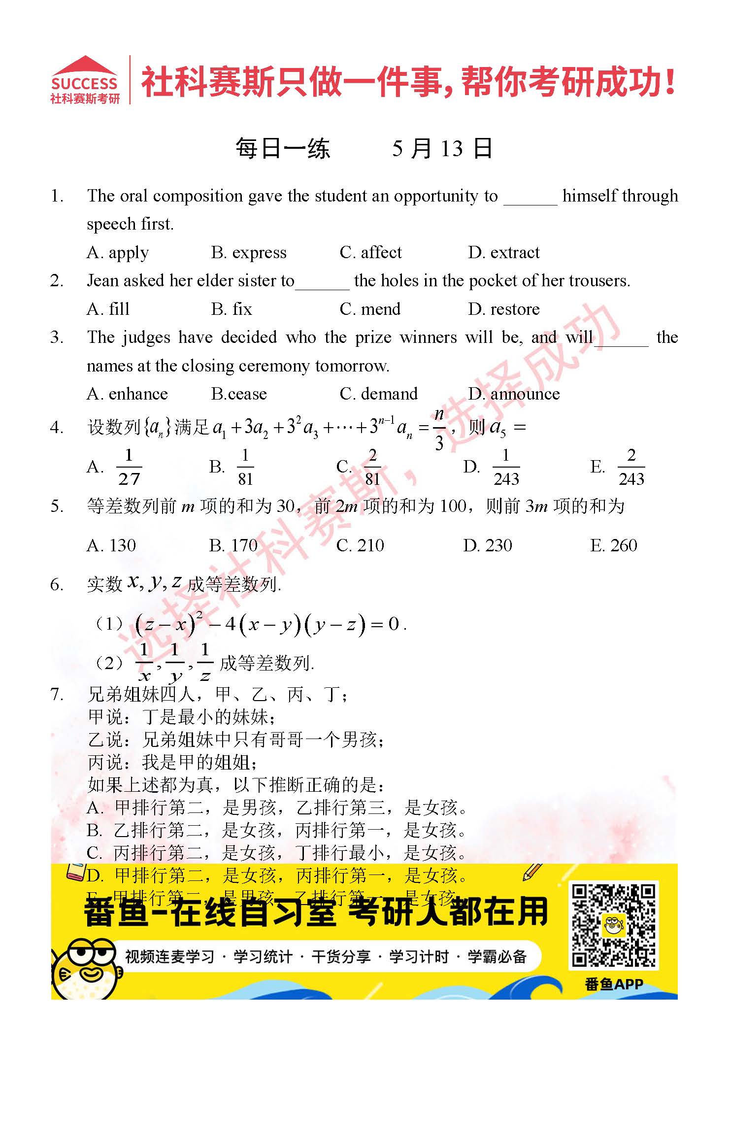 導讀:考研是一場持久戰,保持良好的學習習慣,是能確保復習高效的關鍵。今天社科賽斯MBA備考網小編整理了“2022管理類聯考5月13日每日一練及答案”的內容,希望能對廣大考生有所幫助。