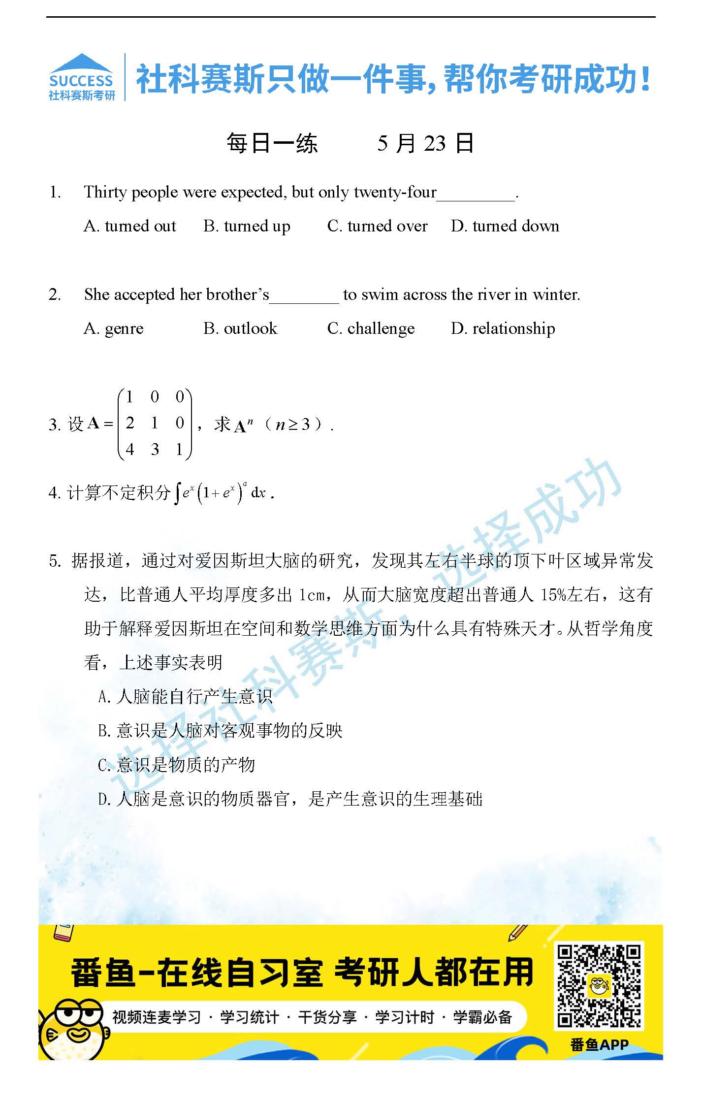 導(dǎo)讀:考研是一場持久戰(zhàn),保持良好的學(xué)習(xí)習(xí)慣,是能確保復(fù)習(xí)高效的關(guān)鍵。今天社科賽斯MBA備考網(wǎng)小編整理了“2022管理類聯(lián)考5月23日每日一練及答案”的內(nèi)容,希望能對廣大考生有所幫助。