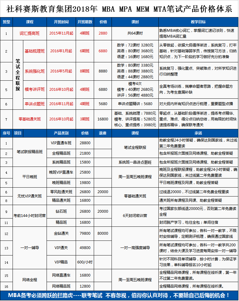 導讀:北京社科賽斯2018年 MBA、 MPA、 MEM、 MTA產品價格體系