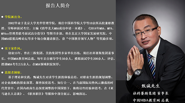 隨后,甄誠先生從“如何認識及利用‘講座’”、“解析當代高校學生特點”、“高校生職業規劃”、“如何保持好習慣”、“如何拓展人脈”、“如何做好組織者”、“如何獲得精彩人生”幾個方面出發,結合自身多年經驗、指導MBA面試實戰經驗,為大家帶來了分量十足的職場干貨,以幽默風趣、真實有用接地氣的言論博得了在場人員的陣陣掌聲。甄誠先生在談及開設高校講座的意義時,語重心長的指出“機會是自己爭取的,不是別人給予的”,并以成功考取清華大學經管學院的社科賽斯學員在千人之中脫穎而出獲得和前美國國務卿賴斯交談的機會為例,鼓勵大家要做足準備,認真對待眼前的每一次機會,做好人生的規劃。