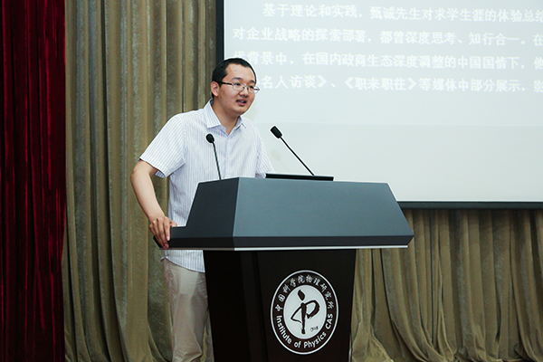 報告會由原物理所團委副書記、研究生會主席、青年志愿者協會學生會長趙國強博士主持。他對甄總的介紹分“學院派出身”、“實干家作風”、“思想者洞察”三個方面展開。甄誠先生在聽眾的熱烈掌聲中開始本次報告會。