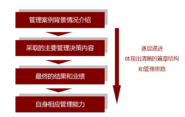 本文的實際案例部分對整體的材料審核打分也很關鍵,申請人應當注意以下核心問題:(1)切忌寫成流水賬,應當按照較為清晰的文章段落篇章架構;(2)應當有較為清晰的管理決策內容和管理思路;(3)實際案例應當體現出深刻的管理思維和出眾的管理決策能力;(4)內容切忌空洞,應當有較為豐富、切實的管理情境和行業背景的體現。