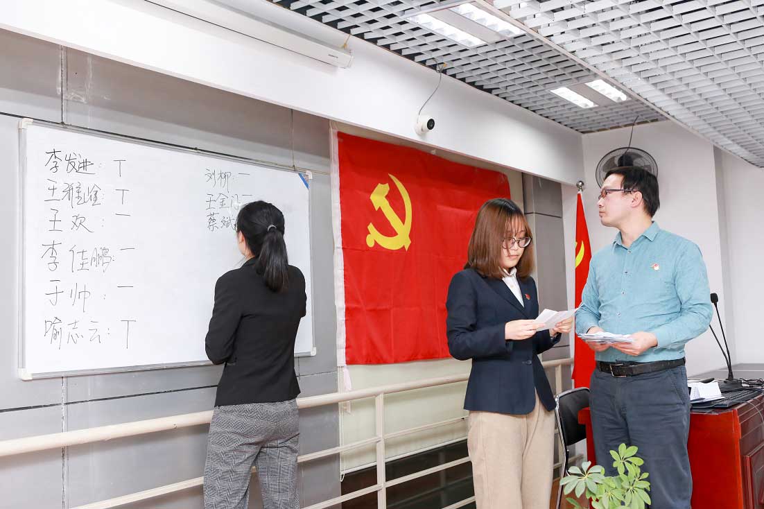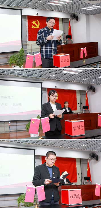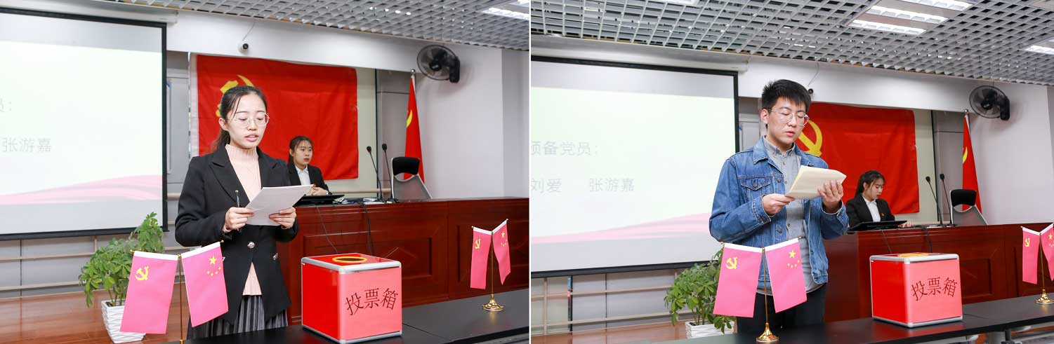 隨后進行預備黨員轉正大會。劉愛、張游嘉兩名預備黨員分別鄭重地向黨組織匯報了自身預備期間的思想情況、工作情況,以端正積極的態(tài)度表達了轉為正式黨員的強烈愿望;入黨介紹人分別就兩位同志預備期間的表現(xiàn)發(fā)表了意見,組織委員代表支委會介紹預備黨員在預備期的表現(xiàn)情況,肯定成績,指出缺點和不足,提出能否轉正的意見;經過與會黨員的充分討論之后,進行無記名投票。