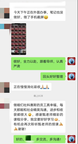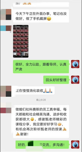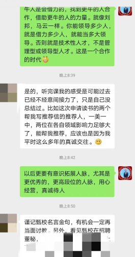 “你認識的人有多少,你的世界就有多大”。甄總認為,結交高人成大事,結交小人不壞事,要拒絕無效社交。甄總建議,把微信當做人脈拓展的利器,并展示了和多位學員的聊天記錄,向大家示范了微信溝通過程中必備的措辭,結構,語氣等,內(nèi)容極為精彩。