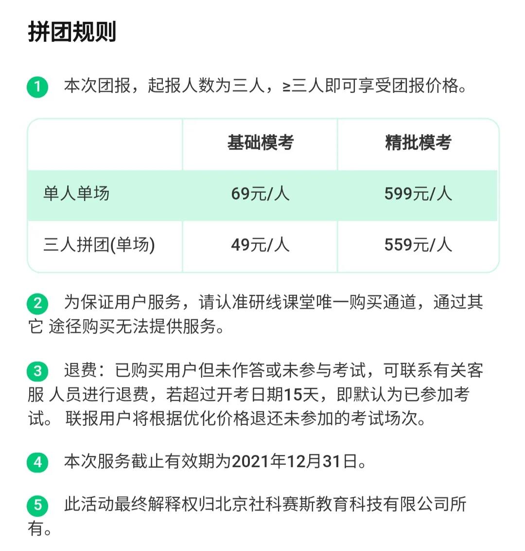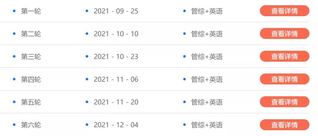 模考共計六輪,考試科目為管綜+英語二,考試時間為上午8:30-11:30,下午14:00-17:00,嚴(yán)格按照真實(shí)考試標(biāo)準(zhǔn)進(jìn)行。第一輪模考時間為9月25日,想要參加的同學(xué)抓緊報名~