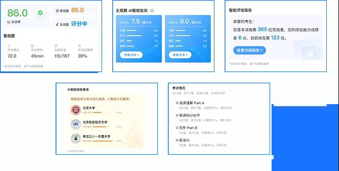 令人驚喜的是,考試結(jié)束后將展示各題型考試情況、模考成績排名、多輪模考成績走勢、AI智能院校推薦,幫助我們了解自己的成績水平,科學(xué)精準(zhǔn)擇校!