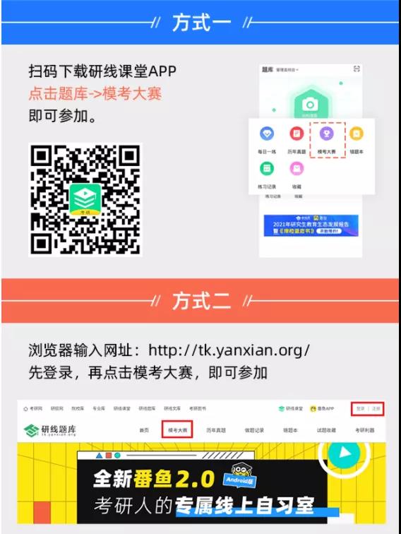 同學(xué)們可通過下載研線課堂app或?yàn)g覽器輸入網(wǎng)址進(jìn)行模考。
