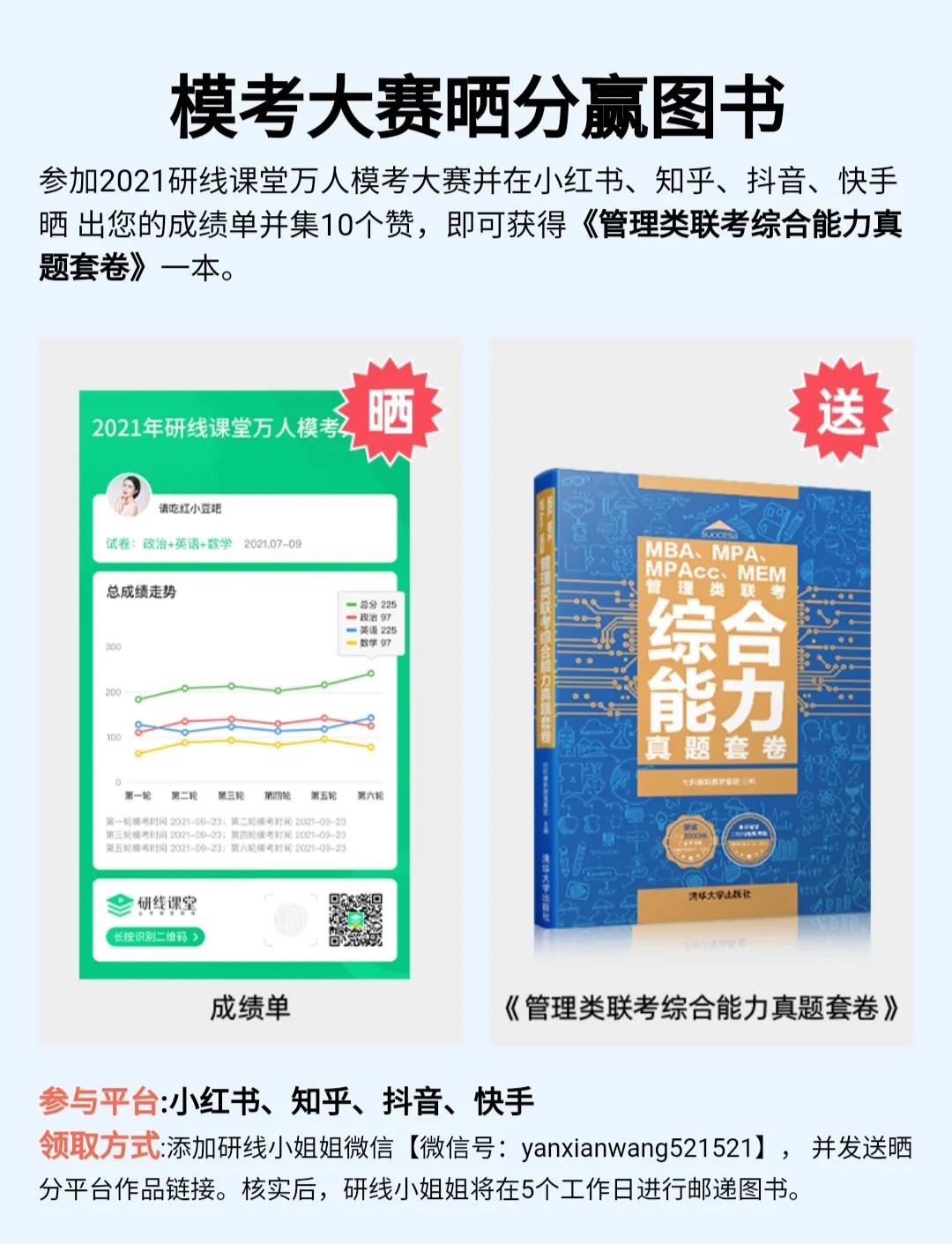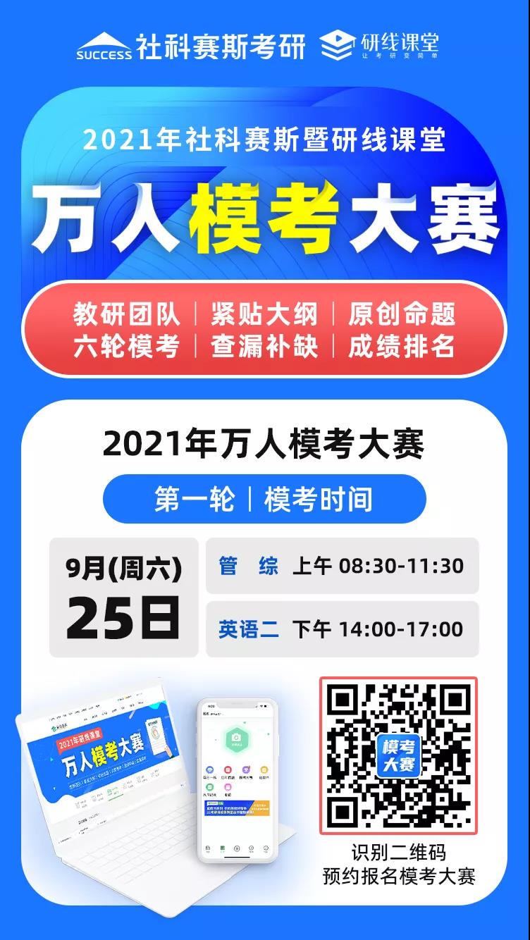 導(dǎo)讀:“2021年研線課堂萬人模考大賽”現(xiàn)開啟報名預(yù)約模式,為了能考個不錯的分?jǐn)?shù),為了能考上心儀院校,讓我們一起努力學(xué)習(xí)吧!